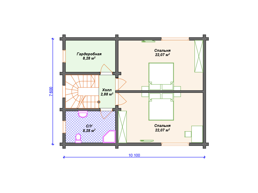 Второй уровень дома также отведен под жилые комнаты. Здесь есть две полностью одинаковых симметричных спальни. Из холла у лестницы легко попасть в гардеробную или общий санузел.