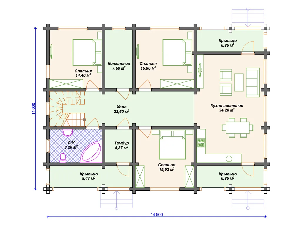 Только на первом уровне находится три спальни. Для лучшей изоляции помещений друг от друга между ними расположены котельная и тамбур. В том же коридоре расположен общий санузел и лестница на мансарду.