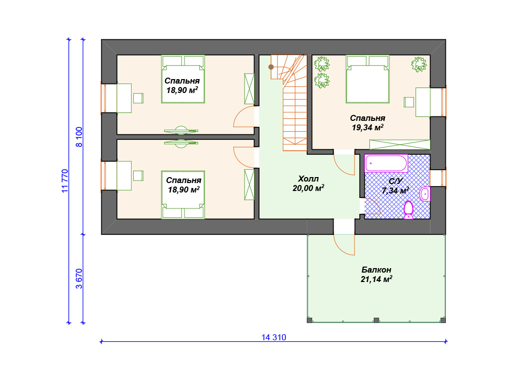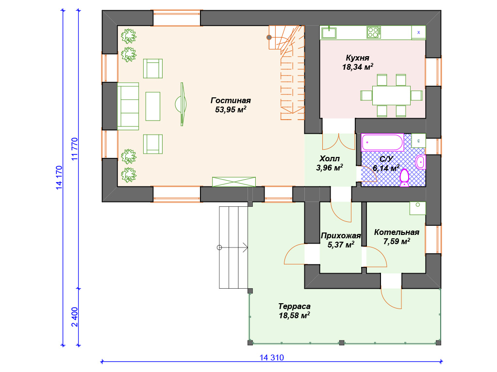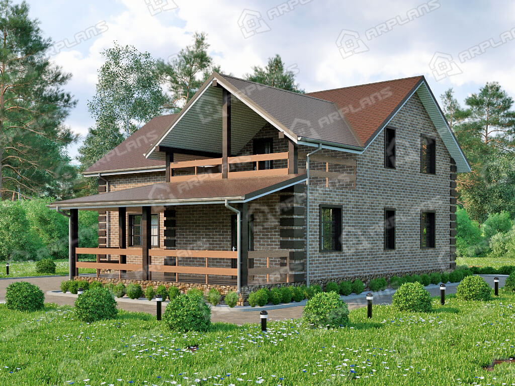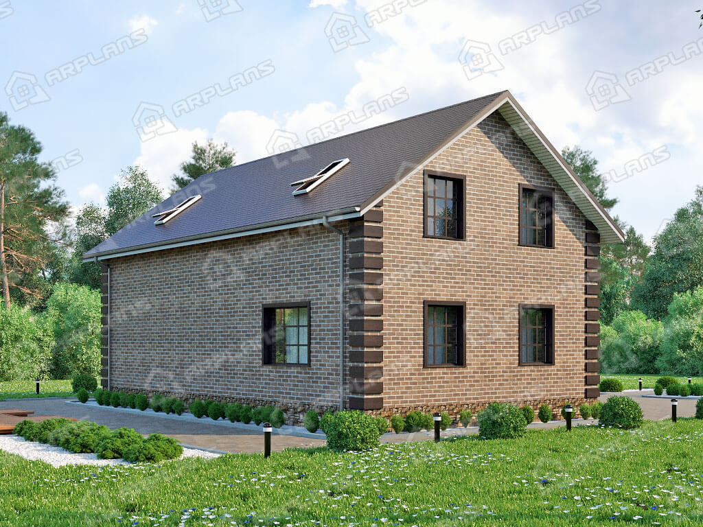 S4-220 (К-020) Дом выполнен из кирпича, с облицовкой наружных стен - облицовочным кирпичом. Строительство здания осуществляется на фундаменте - монолитная плита. Входим в дом с г-образной террасы площадью 18.58 кв м, накрытой отдельной крышей от дома. Первый этаж отведен под дневную зону и технические помещения. Терраса заменяет крыльцо, с которой можно попасть в прихожую и котельную 7.69 кв м, рассчитанную под газовое оборудование. Так же в котельной предусмотрен дополнительный вход с террасы. Из прихожей далее проходим в небольшой холл около 4 кв м. Сразу при входе по правую руку размещён с/у с ванной, прямо вход в кухню 18.34 кв м. Большая половина первого этажа отведена под просторную и большую гостиную, площадь которой 63.95 кв м. Здесь же расположена межэтажная лестница. Второй этаж спальная зона из трёх спальных комнат и совмещённого с/у с ванной 7 кв м. Две комнаты 18.90 кв м и одна 19.34 кв м. На этаже предусмотрен балкон, расположенный над террасой. Дом достаточно простой, но с комфортными площадями. Отлично подойдёт для круглогодичного проживания.