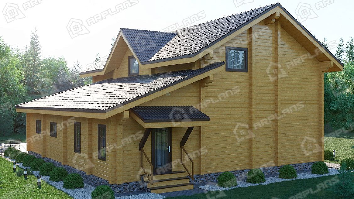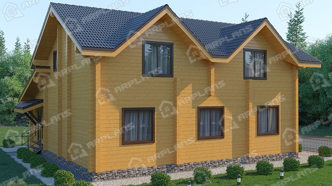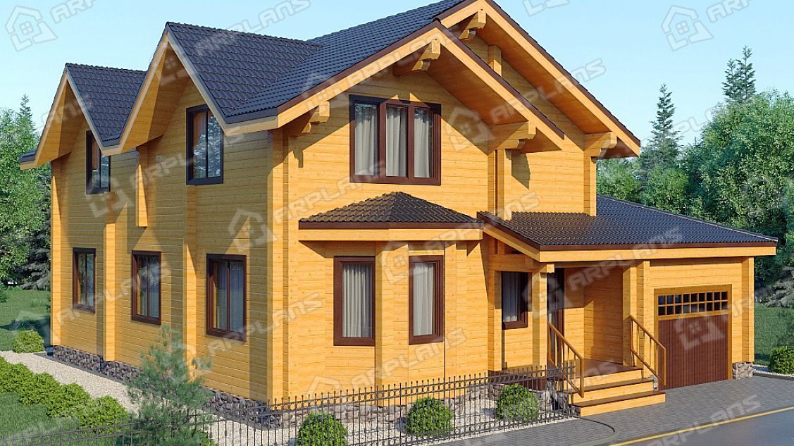 S4-221 (ДС-043) Дом прямоугольной формы, выполнен из бруса 200х180 мм. Конструкция кровли - двухскатная. Строительство здания осуществляется на свайно-ростверковом фундаменте. Входим в дом с крыльца и проходим в тамбур, который освещается дневным светом через окно. С тамбура попадаем в прихожую 6 кв м, по правой стороне которой расположен шкаф-купе для верхней одежды. Далее холл, который расположен по центру дома и отсюда открываются двери во все помещения этажа. Левую половину дома занимает гостиная совмещенная с кухней в одно просторное помещение 39 кв м. Зона гостиной расположена в эркере, состоящий из трёх окон, что делает не только краше фасад, но и дает очень много естественного освещения. Рядом с гостиной расположена комната 14 кв м. В конце холла размещён с/у с душевой кабиной. Правую половину дома занимают гараж 27.67 кв м, хоз. помещение и котельная. Котельная большая - 9 кв м - с окном и индивидуальным входом с улицы, ее параметры подходят и для газового котла. Второй этаж спальная зона из двух спальных комнат и просторной ванной. В одной из спален предусмотрена гардеробная. Планировка второго этажа предполагает второй свет. Деревянный дом прекрасно подойдёт для постоянного проживания семьи из 4 человек.