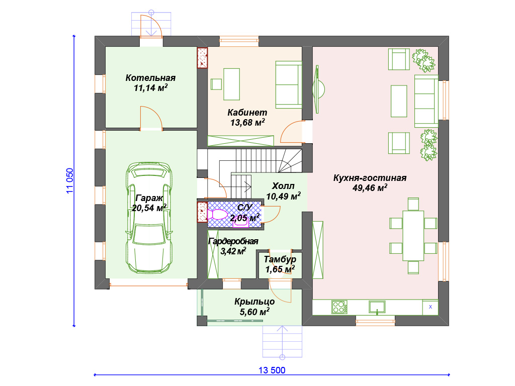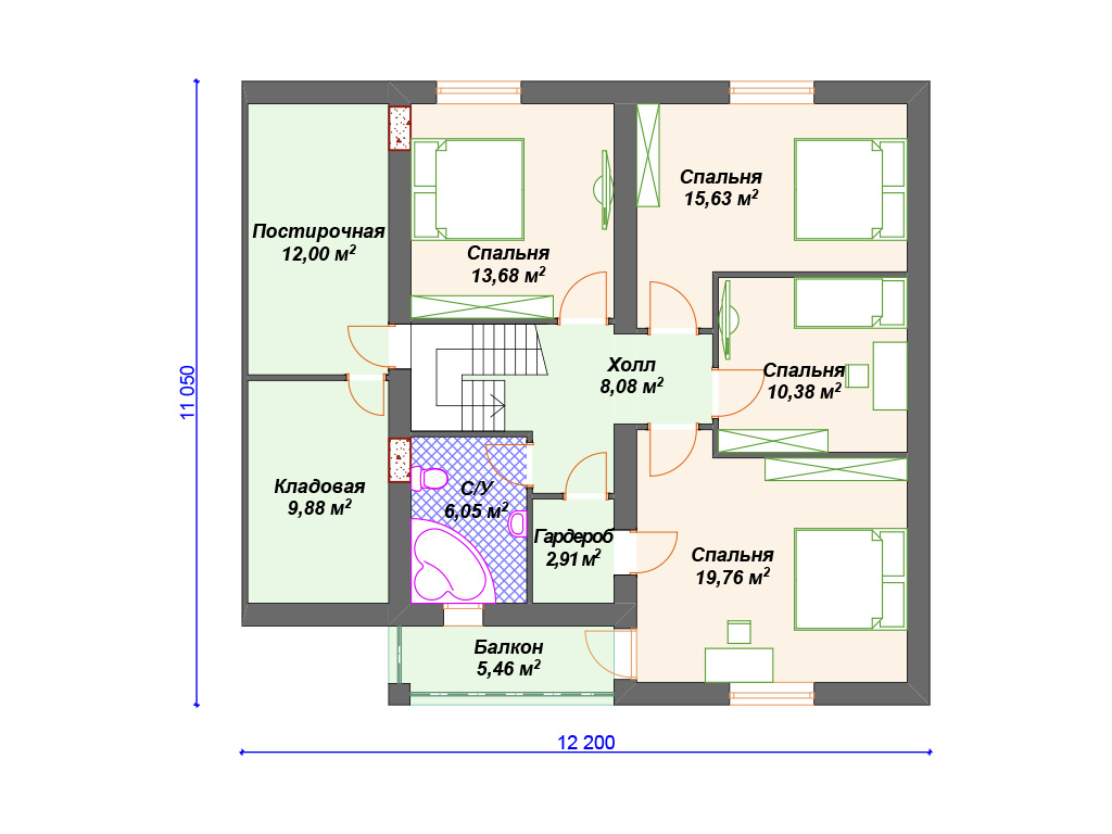 S4-222 (К-079) Дом прямоугольной формы, выполнен из газобетона, толщиной 300 мм, с отделкой наружных стен - штукатурка. Входим в дом с крыльца и попадаем в маленький тамбур. Далее проходим в холл 10.5 кв м. Сразу по левую руку имеется гардеробная и маленький с/у 2 кв м с раковиной. В конце холла размещена лестница на второй этаж. Под маршем которой предусмотрен вход в гараж, площадью 20.5 кв м. В гараже есть окна для естественного освещения и проветривания помещения. Для отопления дома предусмотрена котельная 11 кв м под газовое оборудование. Вход возможен из гаража и с улицы. По правой стороне дома расположена просторная кухня-гостиная почти 50 кв м. Отсюда можно пройти в кабинет 13.6 кв м. Поднимаемся на второй этаж по комфортной п-образной лестнице и проходим в холл 8 кв м. Холл расположен так, что все помещения распланированы вокруг него. На этаже четыре спальни (10 кв м, 13.6 кв м, 15.6 кв м и 19.7 кв м), с/у 6 кв м с душевой кабиной, гардероб почти 3 кв м, кладовая и постирочная. Из спальни большей площади предусмотрен выход на балкон, на главный фасад дома. Отличный проект двухэтажного дома в котором предусмотрено всё для круглогодичного и комфортного проживания семьи более 4 человек.