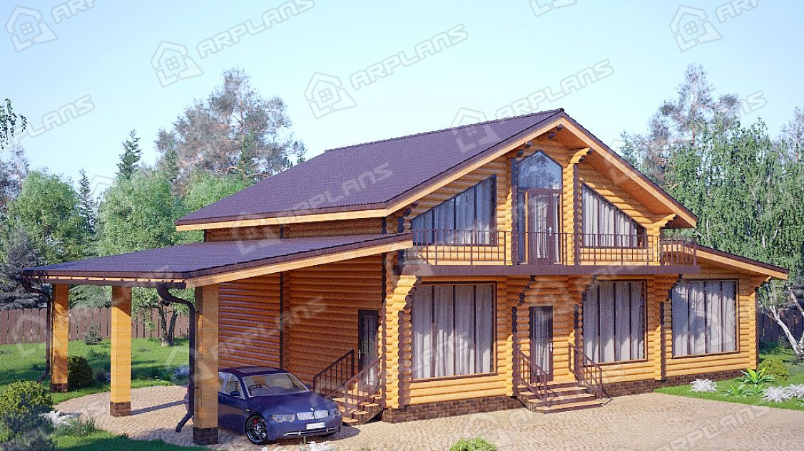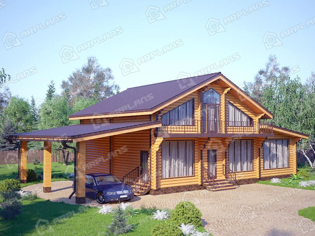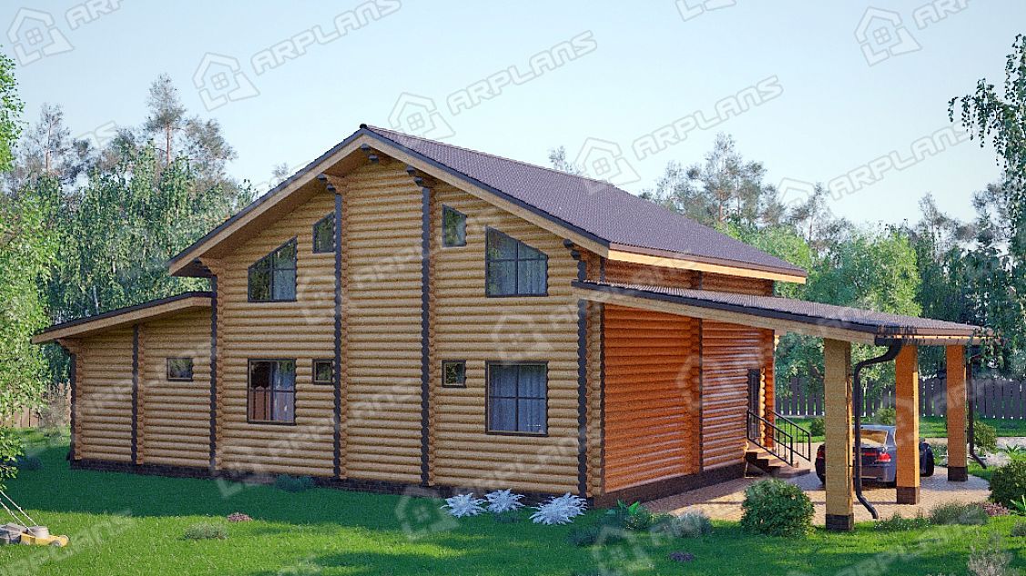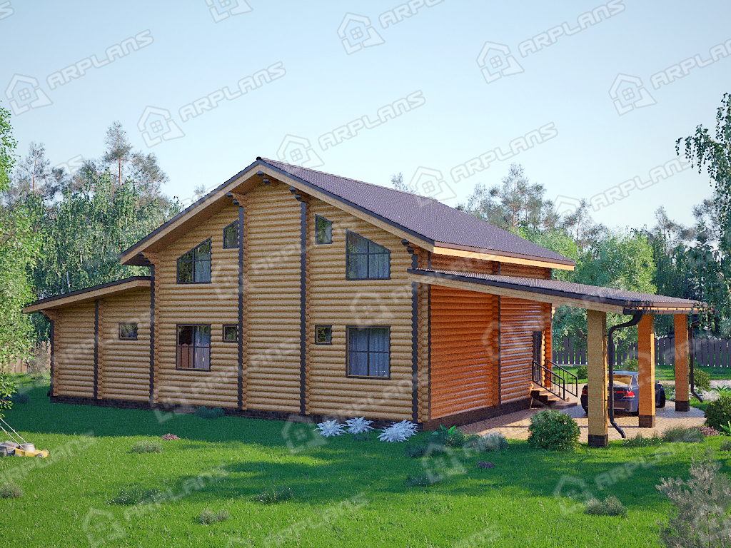 Проект деревянного дома из бревна 10 на 15 с навесом для 2 авто S4-235 (ДО-042)