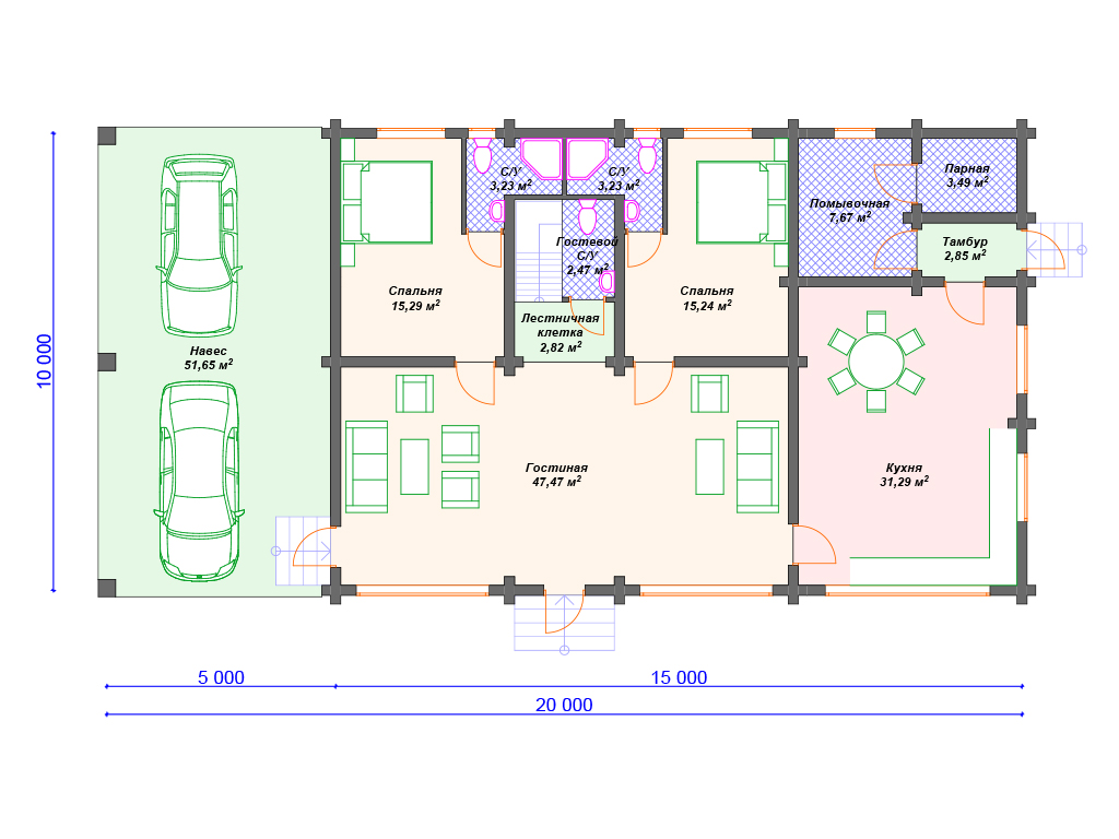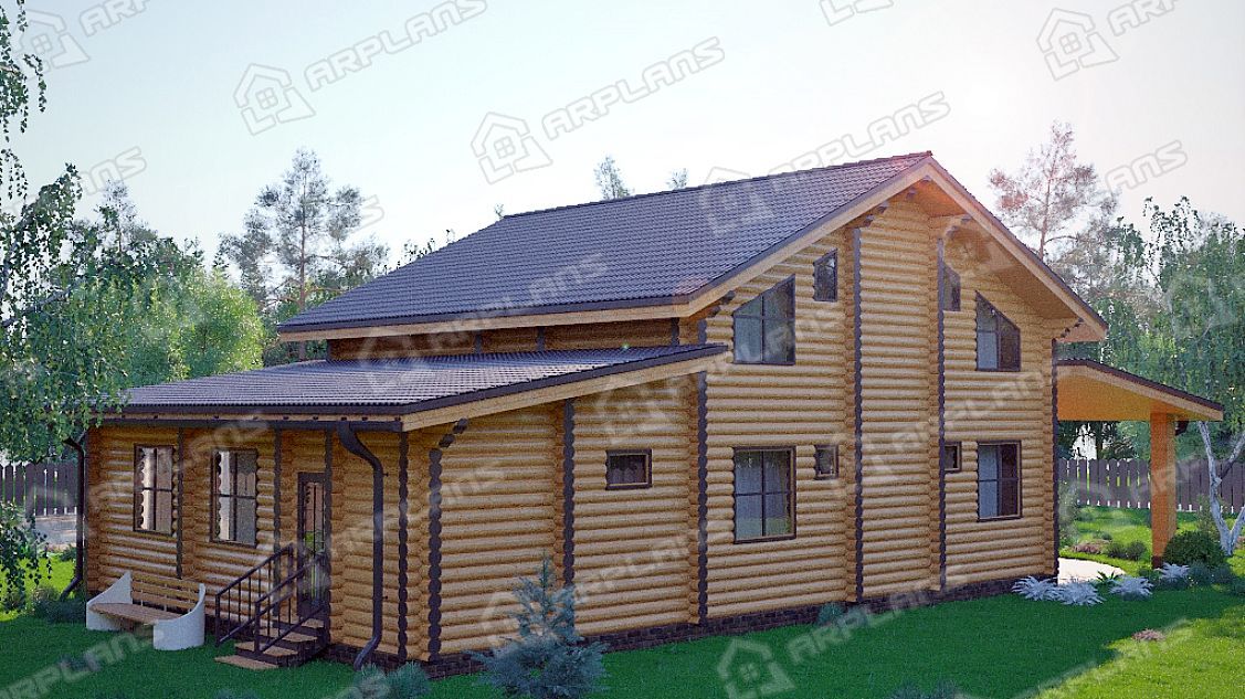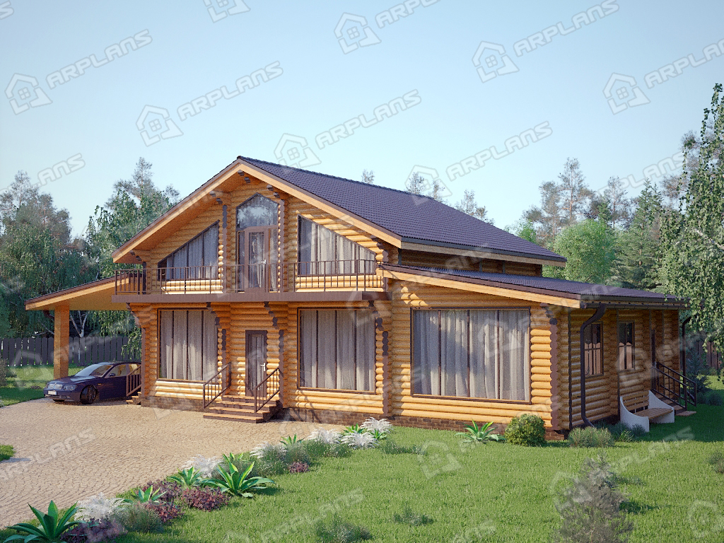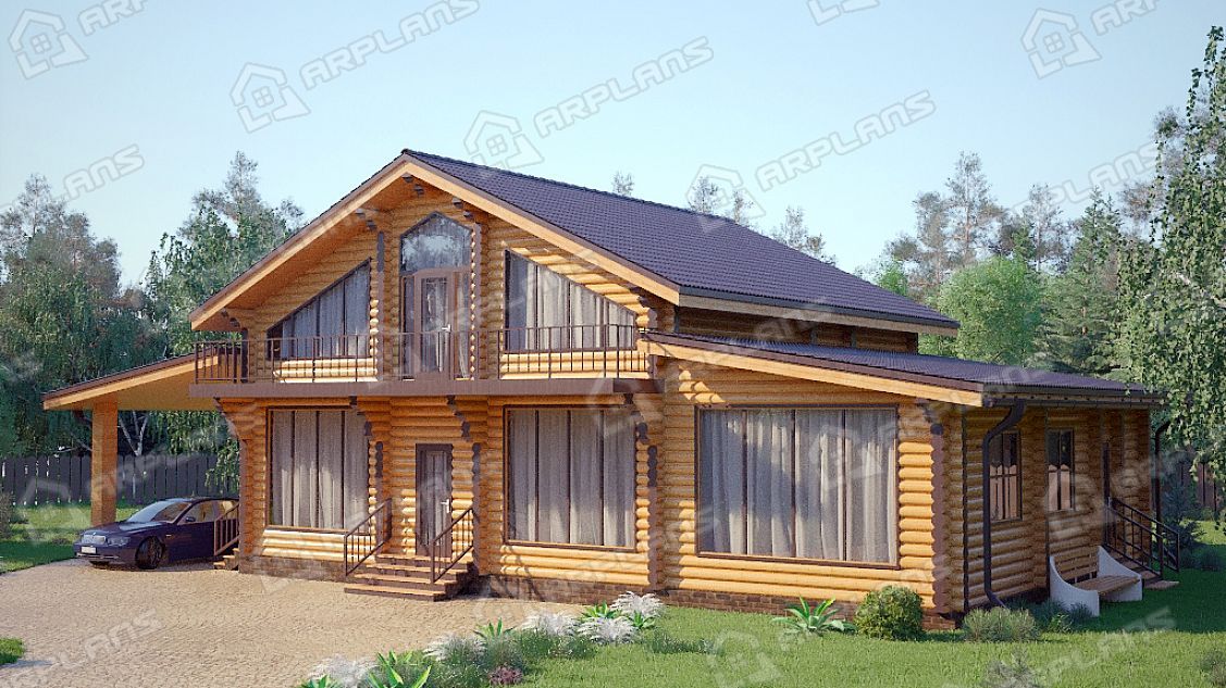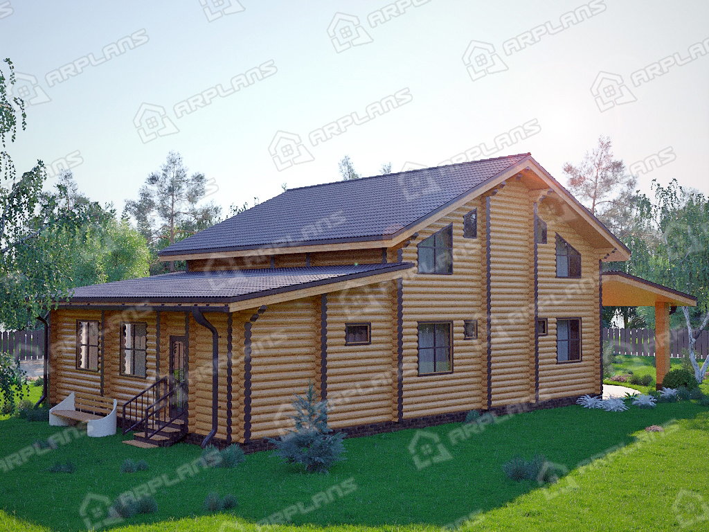 Проект деревянного дома из бревна 10 на 15 с навесом для 2 авто S4-235 (ДО-042)