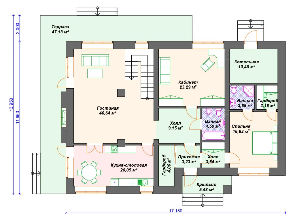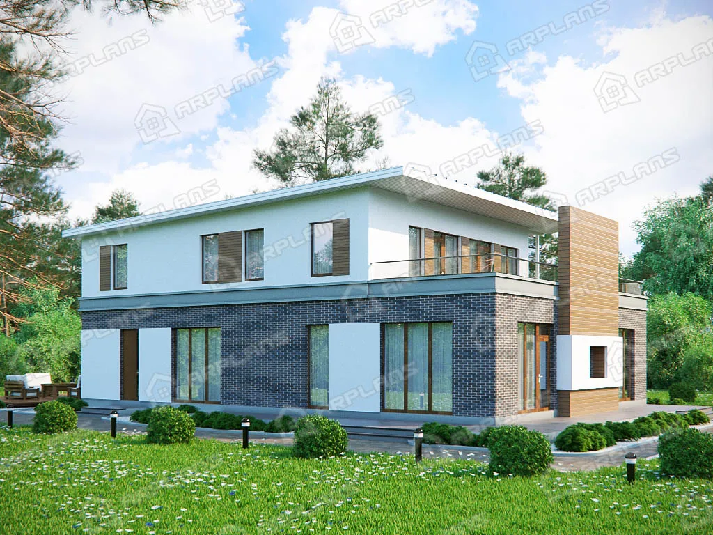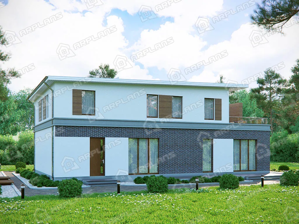 S4-350 (К-181)  Дом двухэтажный, с полноценным 2 этажом, прямоугольной формы, выполнен из газобетона, отделка наружных стен - штукатурка. Входим в дом с крыльца и проходим в прихожую, в которой по левую руку гардероб 4 кв м, а с правой стороны через небольшой холл 3.6 кв м можно пройти в спальню 16.6 кв м. Эту комнату можно использовать при необходимости как гостевую. Комната имеет отдельный гардероб и с/у с душевой кабиной. Из прихожей проходим в холл 9 кв м, из которого имеется доступ во все помещения этажа. На этаже расположен комфортный по площади кабинет 23 кв м, ванная комната, гостиная и кухня-столовая. Гостиная в доме 46.6 кв м. Кухня-столовая 20 кв м. Из этих помещений можно выйти на просторную г-образную террасу, площадью 47 кв м. Для отопления дома предусмотрена котельная 10 кв м под газовое оборудование, с отдельным входом с улицы. Поднимаемся на второй этаж и проходим в холл 12.6 кв м. На этаже четыре спальни. Две спальни (13 кв м, 14 кв м)имеют гардеробную. Родительская спальня 21 кв м с собственной ванной и ещё спальня 14 кв м. Так же на этаже имеется с/у 5 кв м с ванной. Проект удобен для круглогодичного проживания семьи более 4 человек.