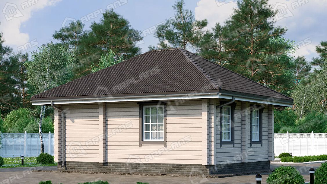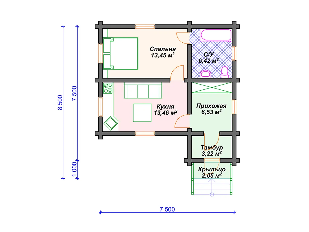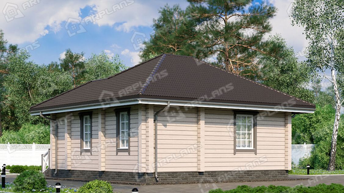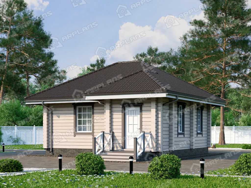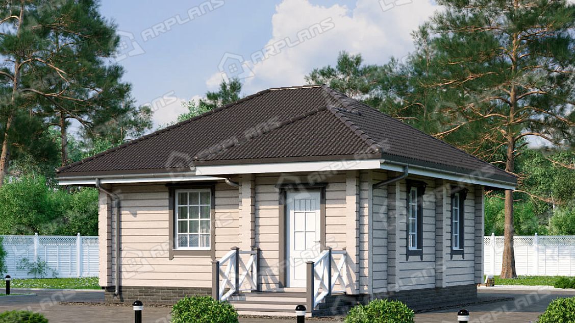 S4-45 (ДС-169) Дом общей площадью - 45 кв м. Габариты дома - 7.50х8.50 м. Деревянный дом прямоугольной формы, выполнен из бруса. Конструкция кровли - четырёхскатная. Строительство здания осуществляется на свайно-ростверковом фундаменте. Перекрытие 1 эт.- деревянные балки. Покрытие кровли металлочерепица. Планировка маленького дачного домика очень проста - это спальня, кухня и с/у. Входим в дом с крыльца и попадаем в тамбур. Наличие тамбура в доме существенно экономится тепло в доме, он отсекает холодный воздух, а так же значительно уменьшает попадания уличной грязи в дом. Из тамбура проходим в прихожую, в которой расположен шкаф для верхней одежды. Далее проходим в кухню, площадью 13 кв м и отсюда имеется вход в спальню равноценную по площади. Санузел в доме 6 кв м, вход в него из спальни. Одноэтажный маленький деревянный дом прекрасно подойдёт как дачный домик.