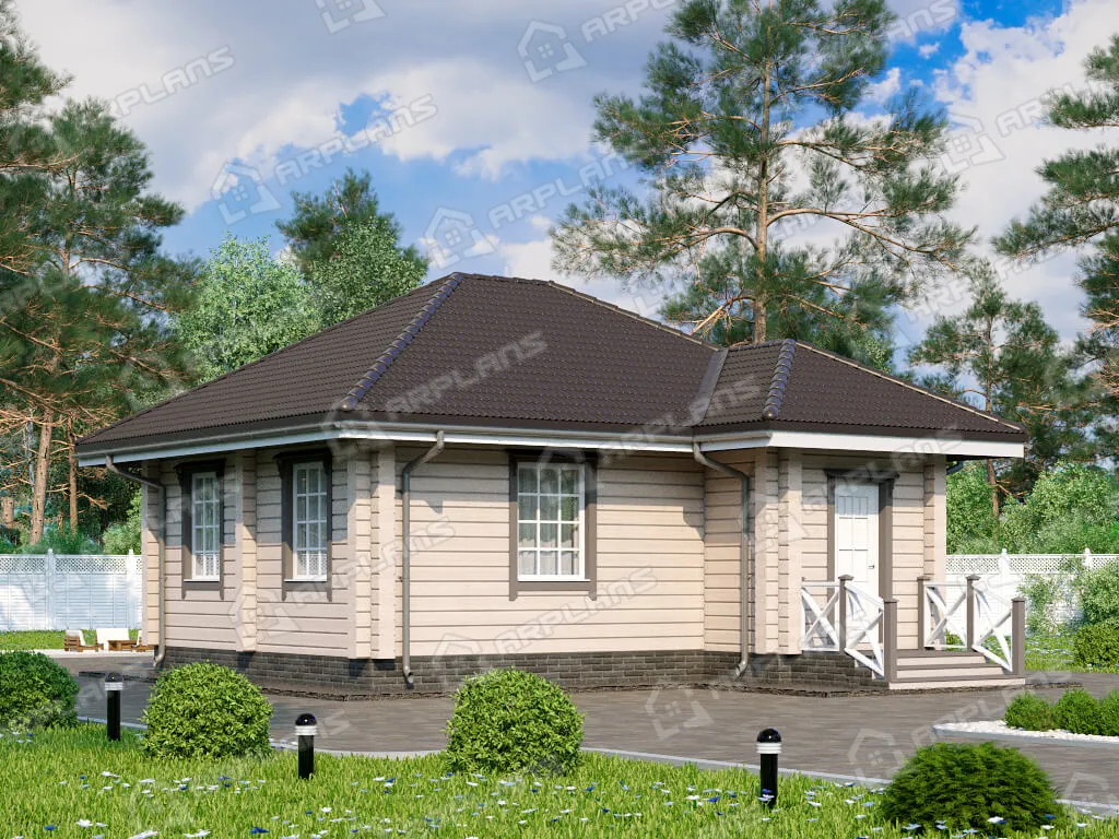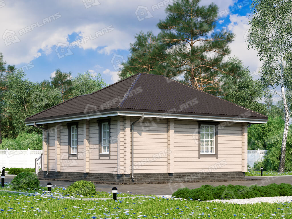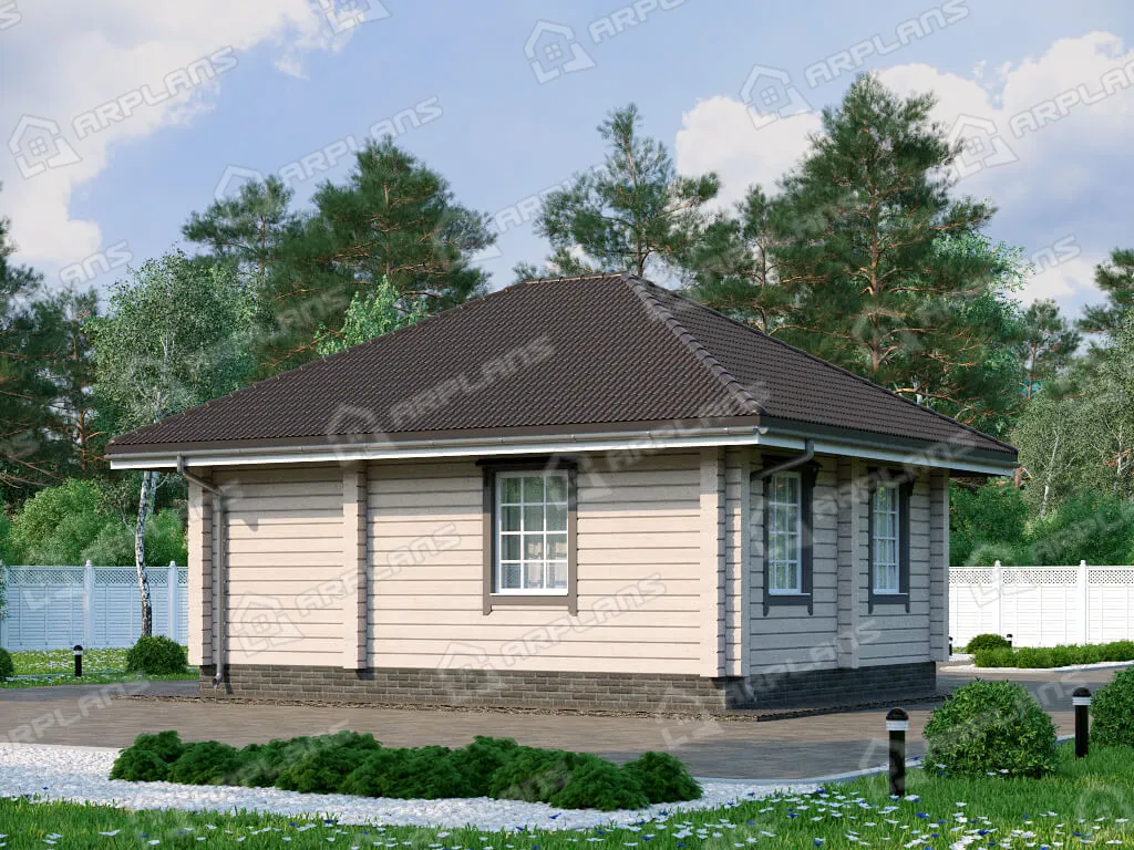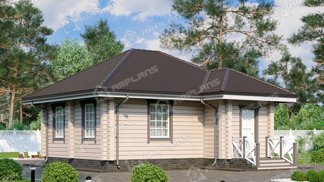 S4-45 (ДС-169) Дом общей площадью - 45 кв м. Габариты дома - 7.50х8.50 м. Деревянный дом прямоугольной формы, выполнен из бруса. Конструкция кровли - четырёхскатная. Строительство здания осуществляется на свайно-ростверковом фундаменте. Перекрытие 1 эт.- деревянные балки. Покрытие кровли металлочерепица. Планировка маленького дачного домика очень проста - это спальня, кухня и с/у. Входим в дом с крыльца и попадаем в тамбур. Наличие тамбура в доме существенно экономится тепло в доме, он отсекает холодный воздух, а так же значительно уменьшает попадания уличной грязи в дом. Из тамбура проходим в прихожую, в которой расположен шкаф для верхней одежды. Далее проходим в кухню, площадью 13 кв м и отсюда имеется вход в спальню равноценную по площади. Санузел в доме 6 кв м, вход в него из спальни. Одноэтажный маленький деревянный дом прекрасно подойдёт как дачный домик.