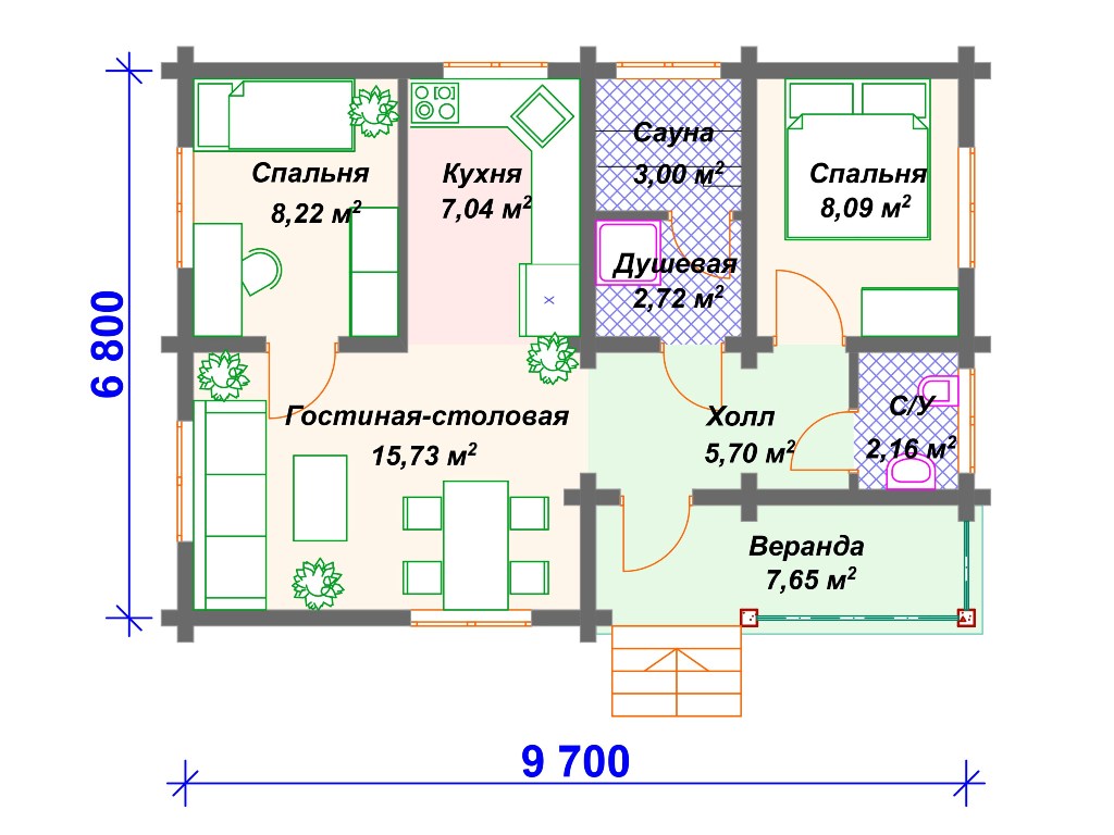 Проект одноэтажного дома с сауной S4-60 (ДС-036)