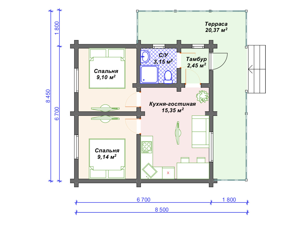 Проект одноэтажного дома с террасой S4-60 (ДС-142)