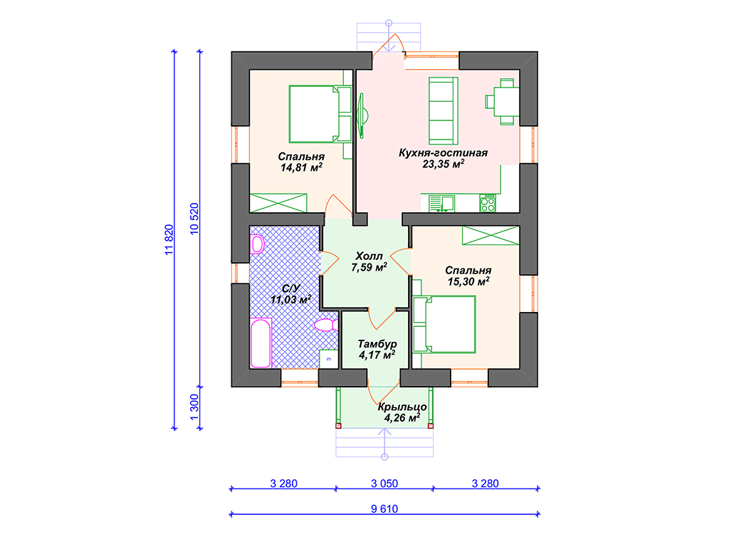 Проект одноэтажного дома с 2 спальнями S4-80 (К-336)