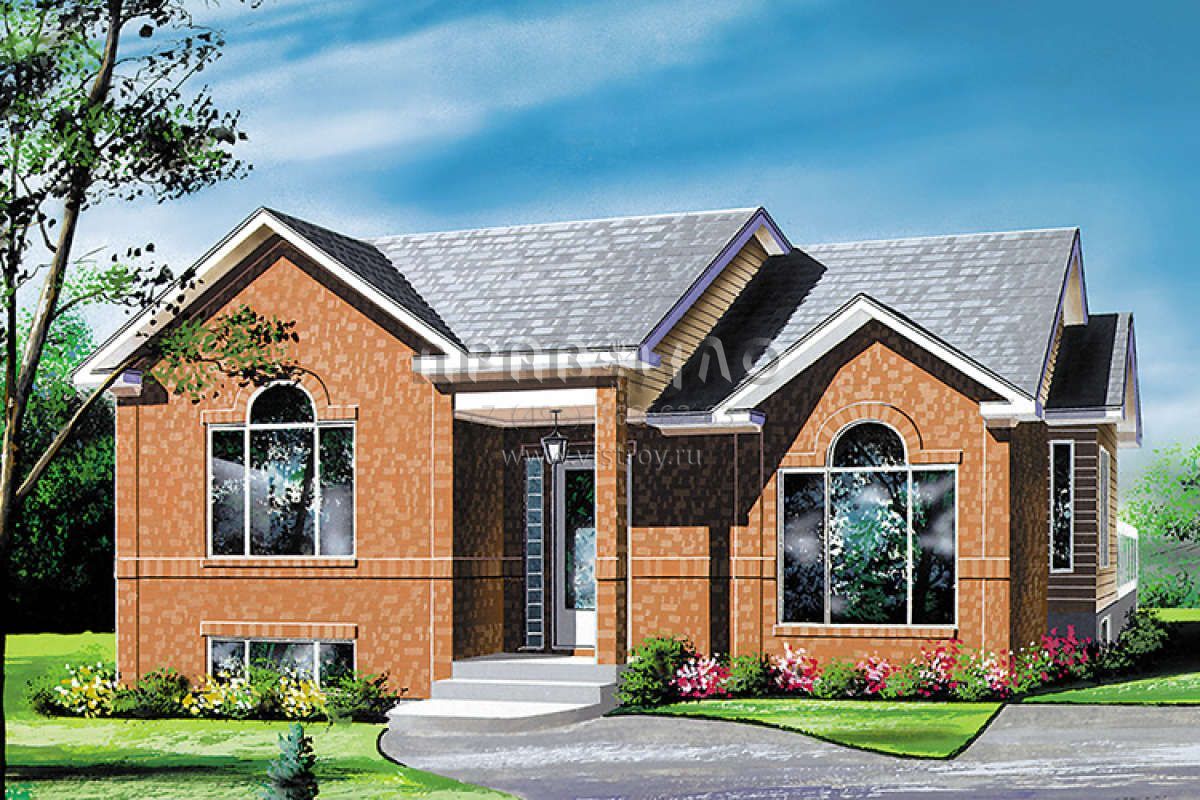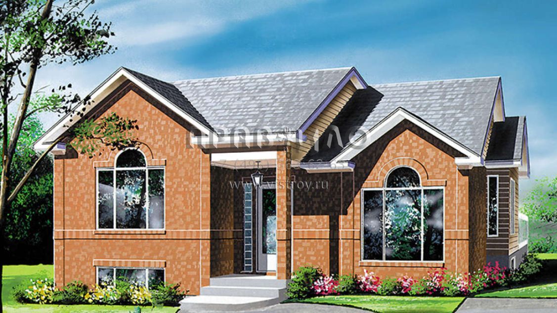 Это проект одноэтажного дома без гаража жилой площадью 105 кв.м. Длина дома 11 м, ширина 10.7 м, высота 6.4 м. В доме три спальни и один санузел.