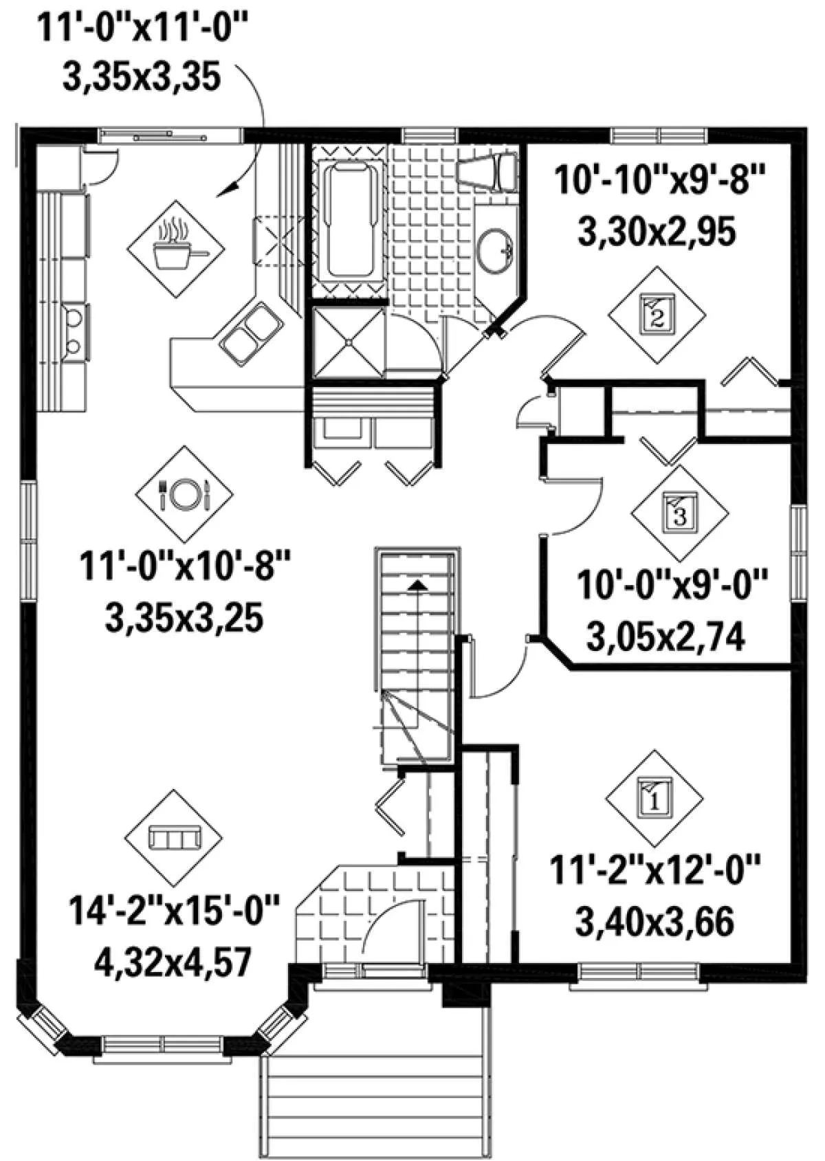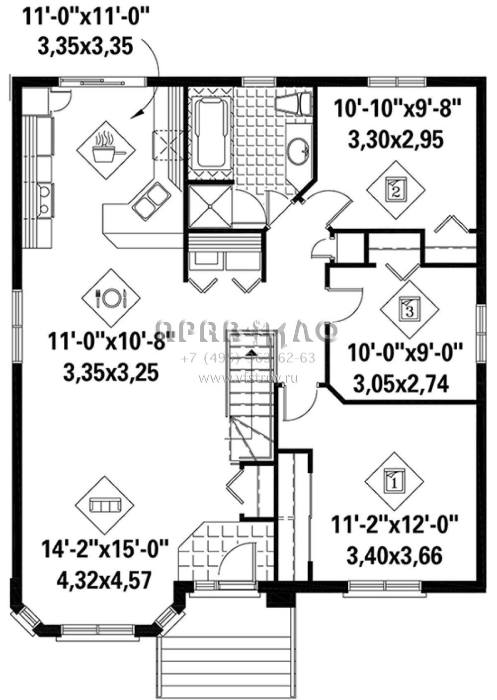 S5-107 (6146-00372) Это иностранный проект, для которого требуется адаптация под нормы, действующие в Российской Федерации. Вы видите проект дома в английском стиле. В этом доме сочетаются черты сельской постройки и аскетичность лофта. Внутри жильцы смогут проводить время с максимальным комфортом. Обратим внимание, что сейчас на планировках все размеры представлены в футах. Для перевода в метры вам необходимо значение в футах умножить на 0,3048.