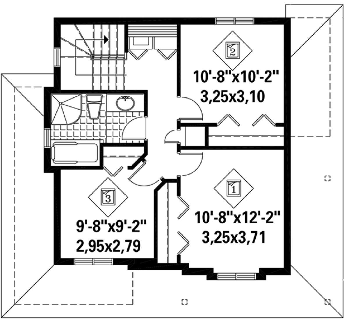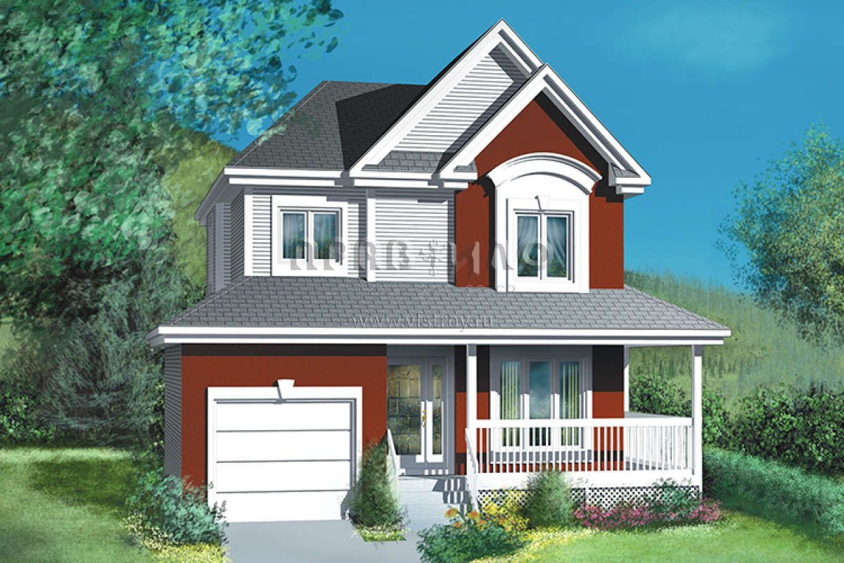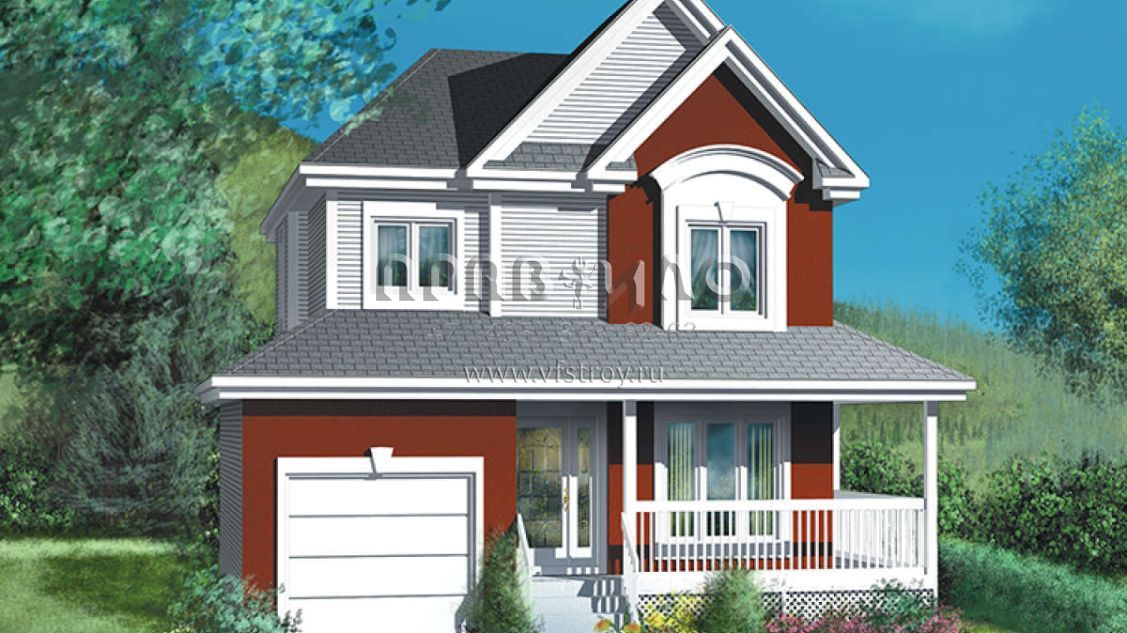 Это проект двухэтажного дома с гаражом на одну машину жилой площадью 108 кв.м. Длина дома 8.8 м, ширина 9.8 м, высота 9.1 м. В доме три спальни и один санузел.