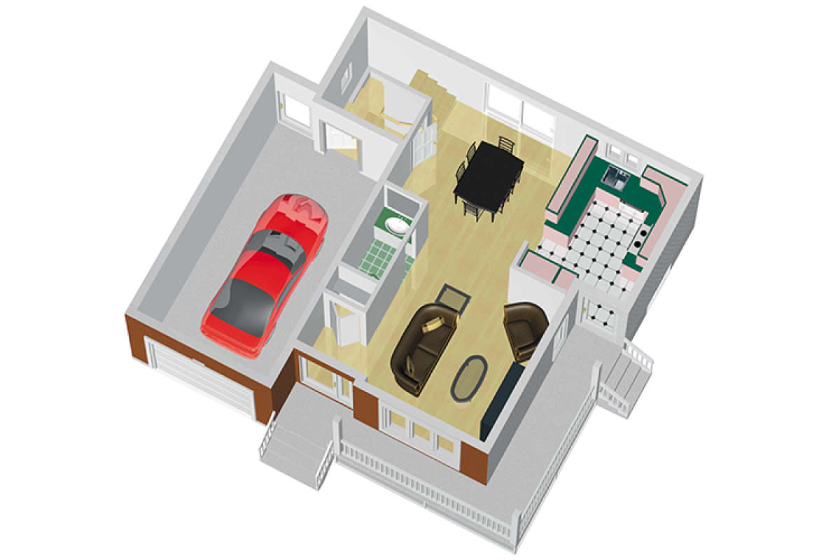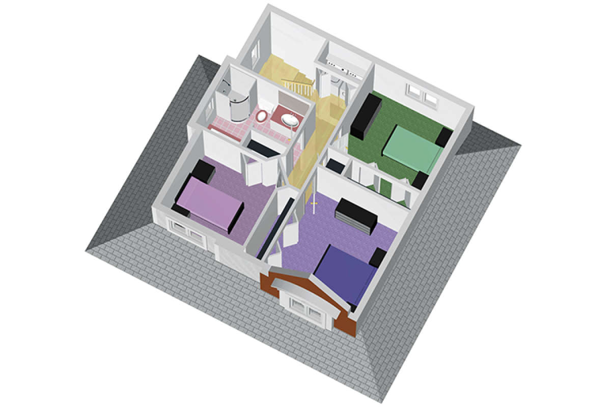 Двухэтажный проект дома позволяет рационально распорядиться площадью участка небольшого размера или узкой формы. На первом этаже находятся общие комнаты (гостиная/столовая, кухня, подсобные и технические помещения), на втором — спальни членов семьи.