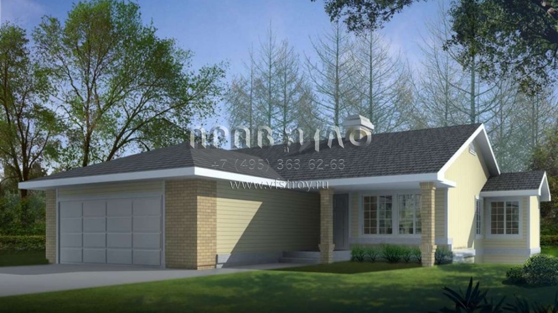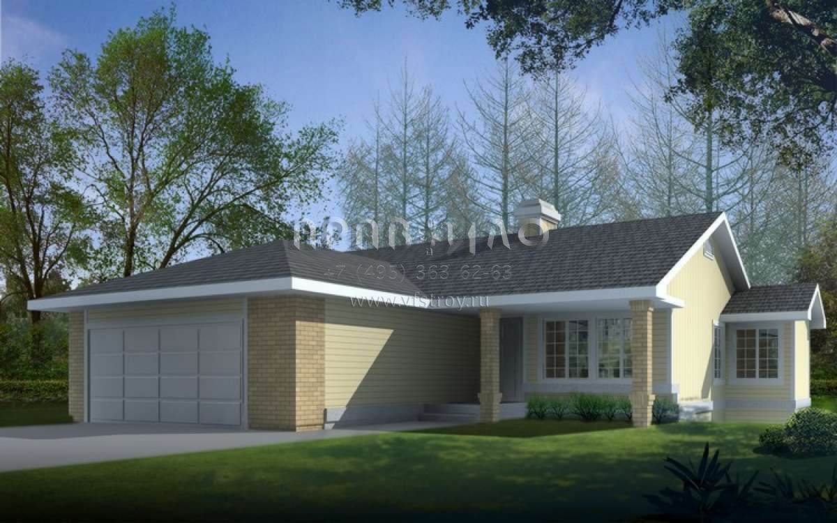 Это проект одноэтажного дома с гаражом на две машины жилой площадью 112 кв.м. Длина дома 15.5 м, ширина 13.7 м, высота 4.9 м. В доме две спальни и два санузла.