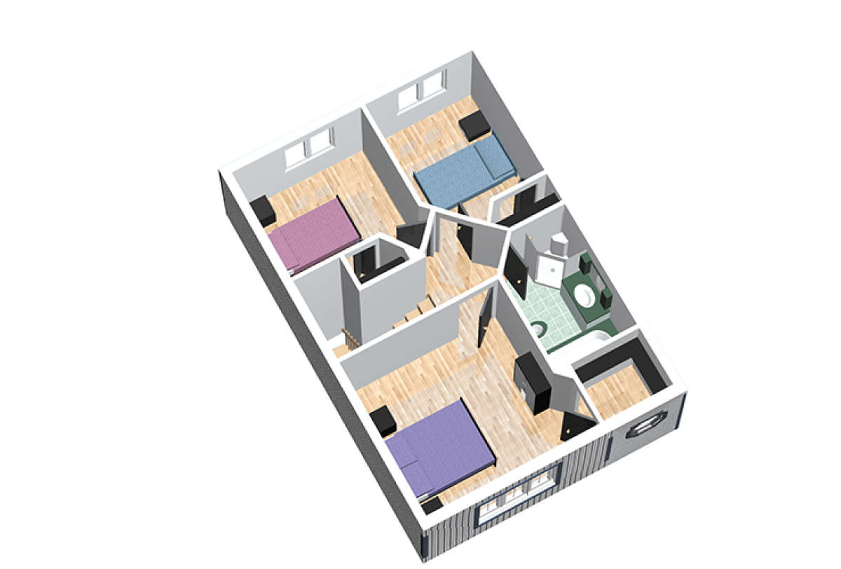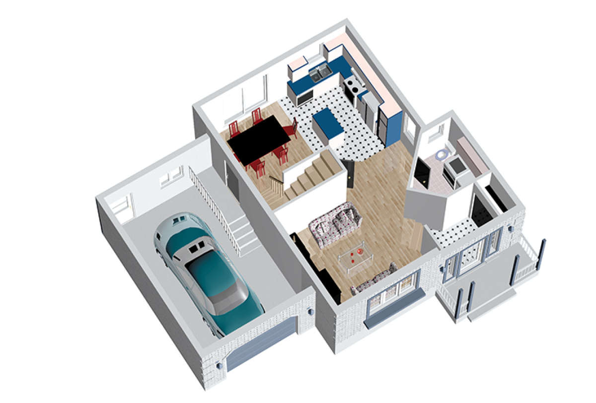 Двухэтажный проект дома позволяет рационально распорядиться площадью участка небольшого размера или узкой формы. На первом этаже находятся общие комнаты (гостиная/столовая, кухня, подсобные и технические помещения), на втором — спальни членов семьи.