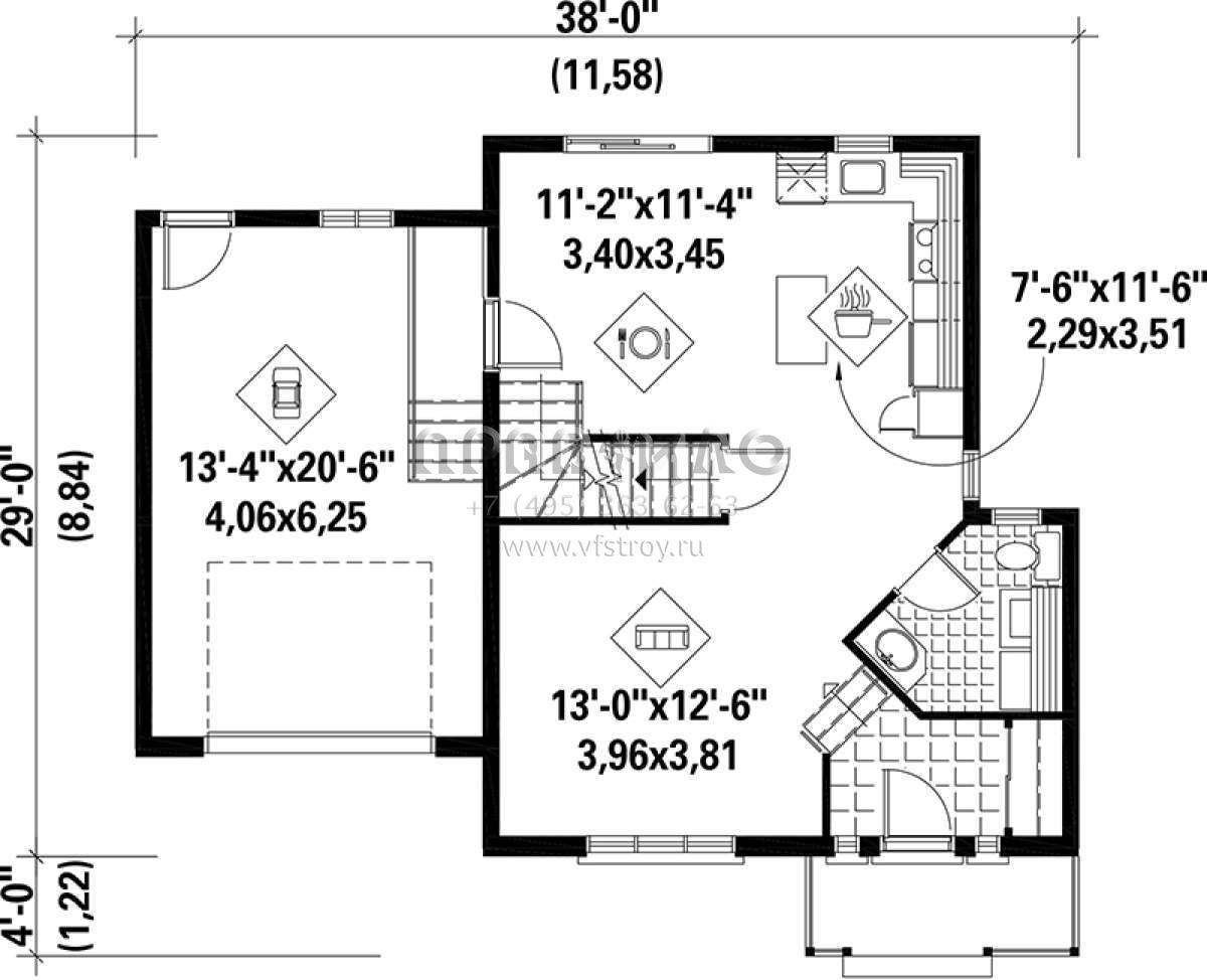 S5-113 (6146-00181) Это иностранный проект, для которого требуется адаптация под нормы, действующие в Российской Федерации. Вы видите проект дома в стиле Ранчо. В этом доме сочетаются черты сельской постройки и аскетичность лофта. Внутри жильцы смогут проводить время с максимальным комфортом. Обратим внимание, что сейчас на планировках все размеры представлены в футах. Для перевода в метры вам необходимо значение в футах умножить на 0,3048.