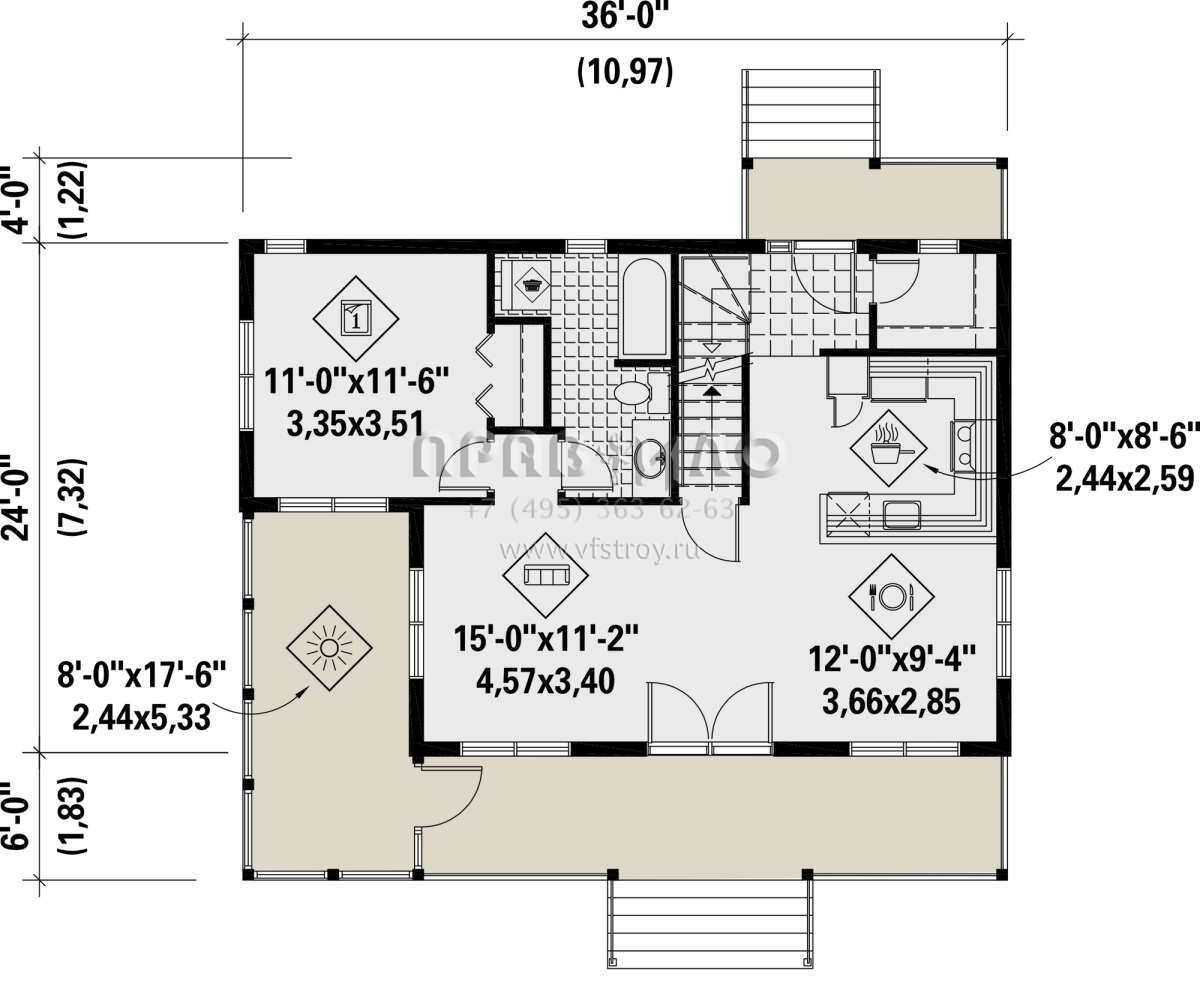 S5-113 (6146-00405) Это иностранный проект, для которого требуется адаптация под нормы, действующие в Российской Федерации. Вы видите проект дома в стиле Ранчо. В этом доме сочетаются черты сельской постройки и аскетичность лофта. Внутри жильцы смогут проводить время с максимальным комфортом. Обратим внимание, что сейчас на планировках все размеры представлены в футах. Для перевода в метры вам необходимо значение в футах умножить на 0,3048.