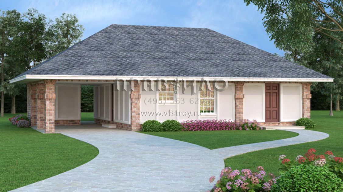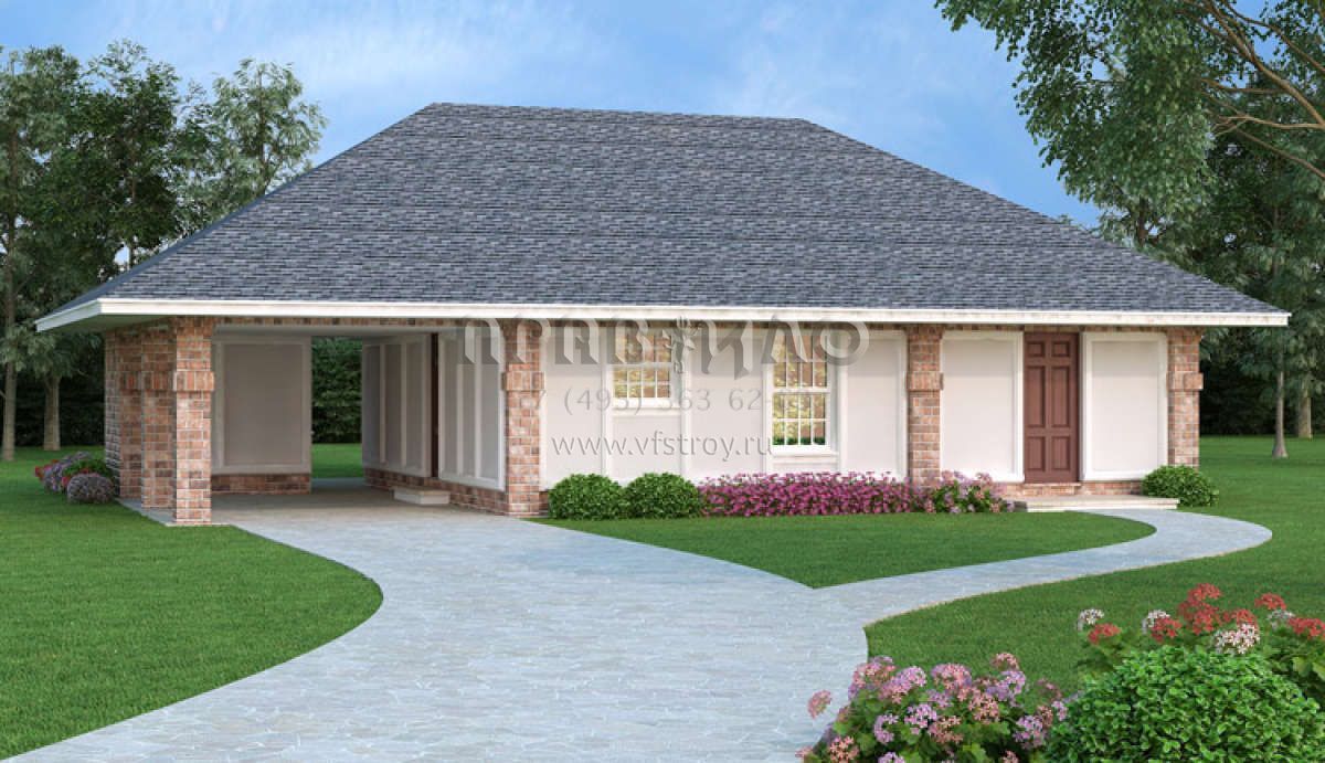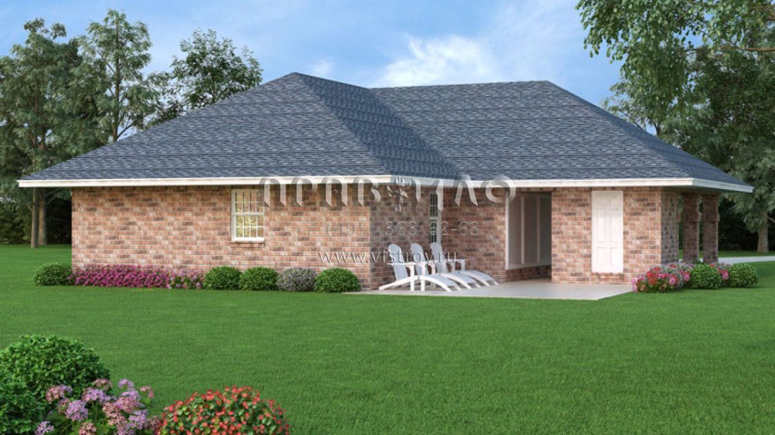 Это проект одноэтажного дома с гаражом на одну машину жилой площадью 115 кв.м. Длина дома 12.8 м, ширина 13.4 м, высота 4.9 м. В доме четыре спальни и два санузла.