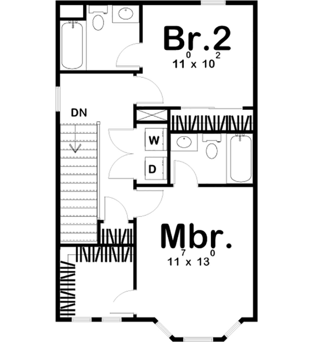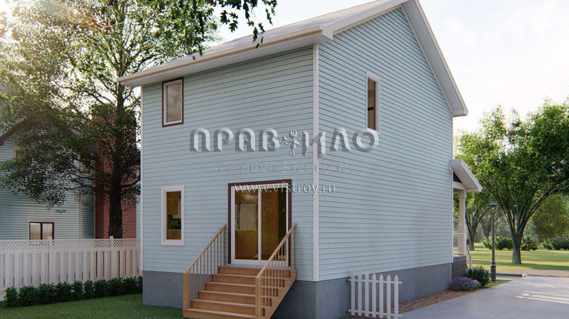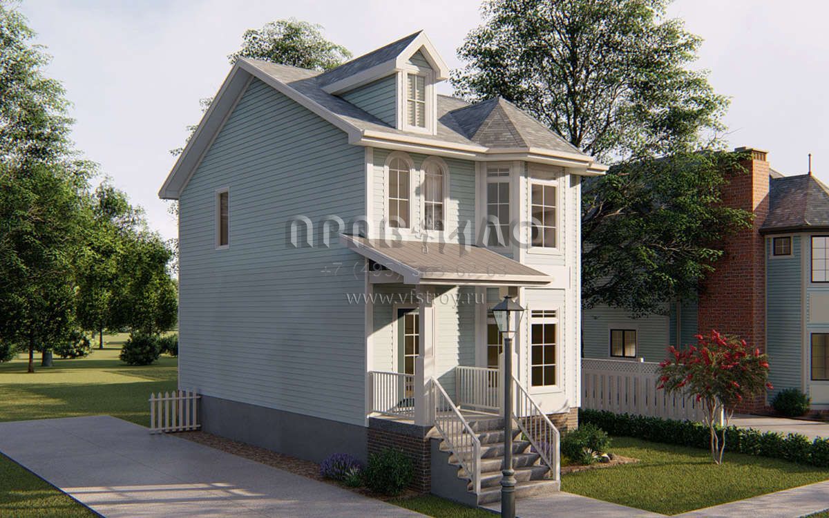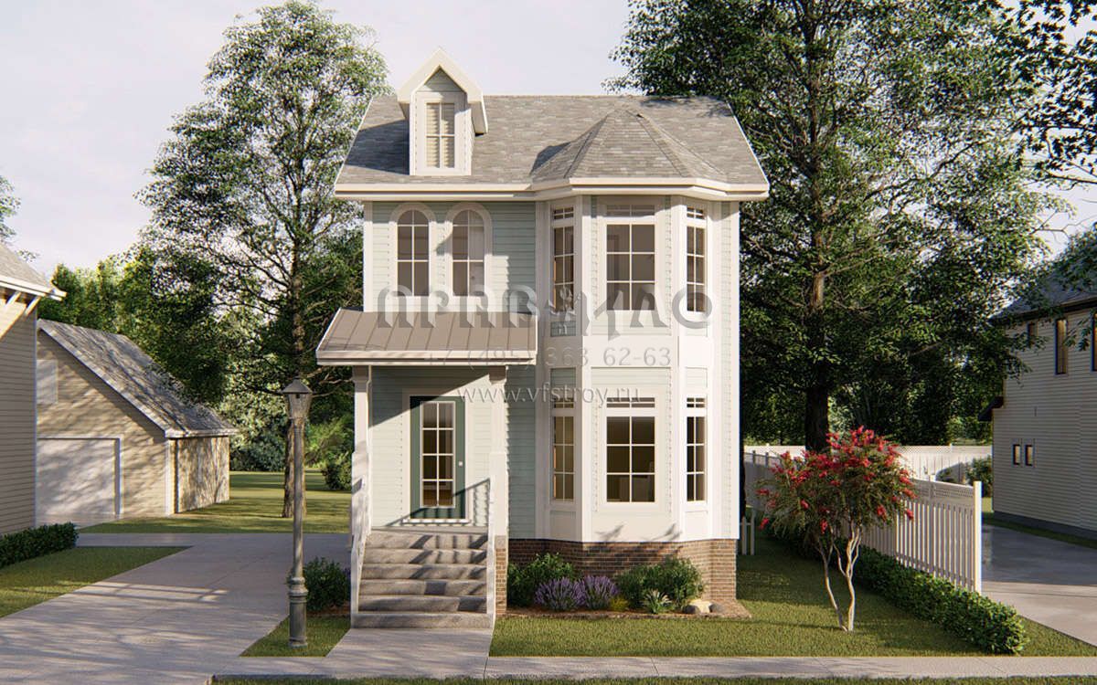 Двухэтажный проект дома позволяет рационально распорядиться площадью участка небольшого размера или узкой формы. На первом этаже находятся общие комнаты (гостиная/столовая, кухня, подсобные и технические помещения), на втором — спальни членов семьи.