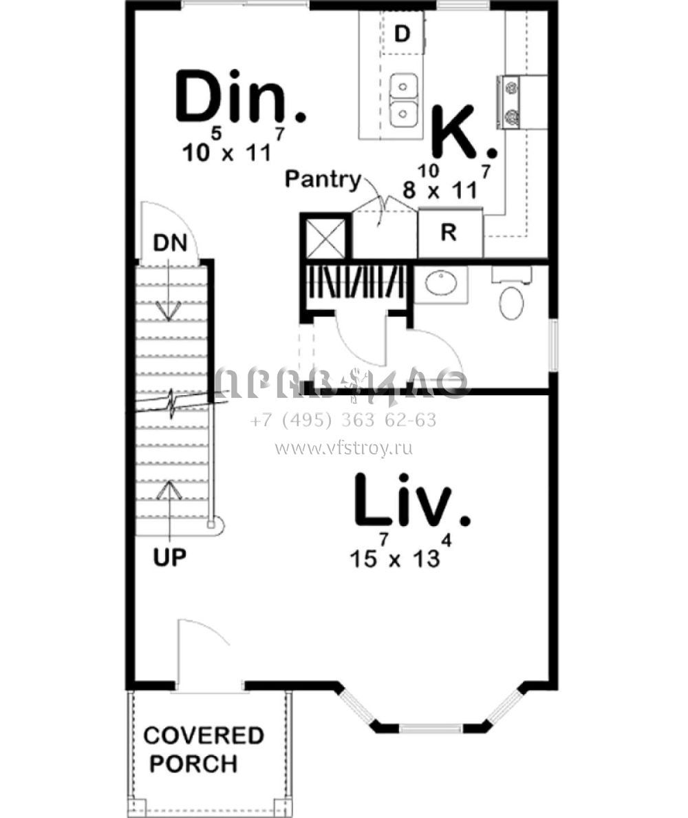 S5-117 (963-00230) Это иностранный проект, для которого требуется адаптация под нормы, действующие в Российской Федерации. Вы видите проект дома в английском стиле. В этом доме сочетаются черты сельской постройки и аскетичность лофта. Внутри жильцы смогут проводить время с максимальным комфортом. Обратим внимание, что сейчас на планировках все размеры представлены в футах. Для перевода в метры вам необходимо значение в футах умножить на 0,3048.