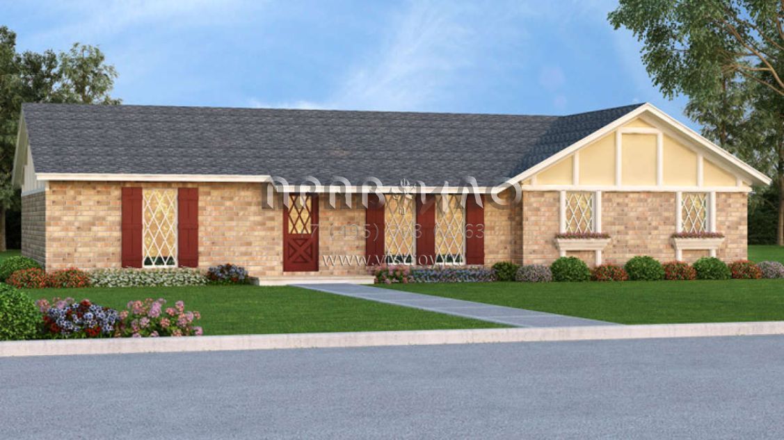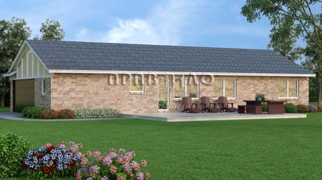 Это проект одноэтажного дома с гаражом на две машины жилой площадью 118 кв.м. Длина дома 9.1 м, ширина 18.3 м, высота 5.2 м. В доме три спальни и два санузла.