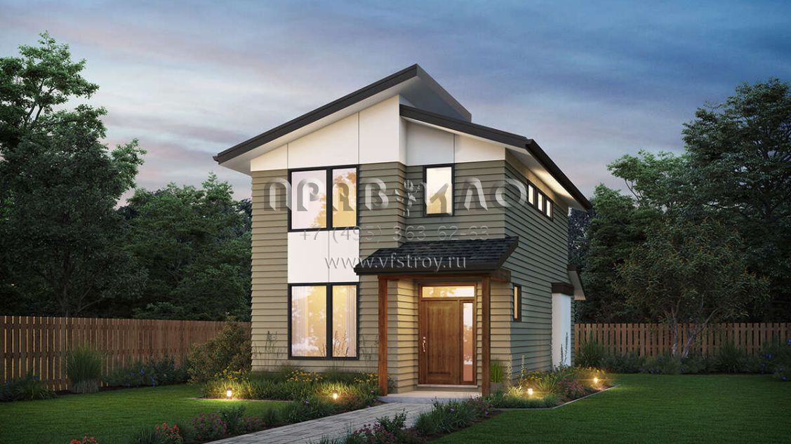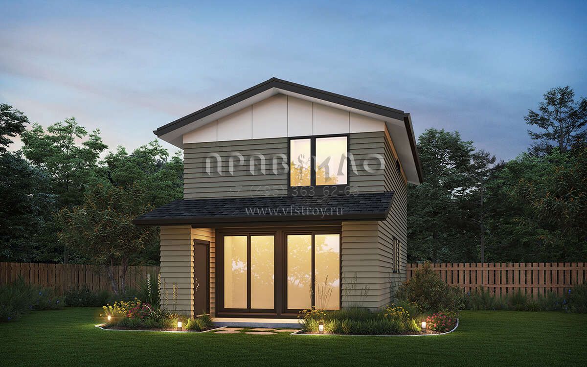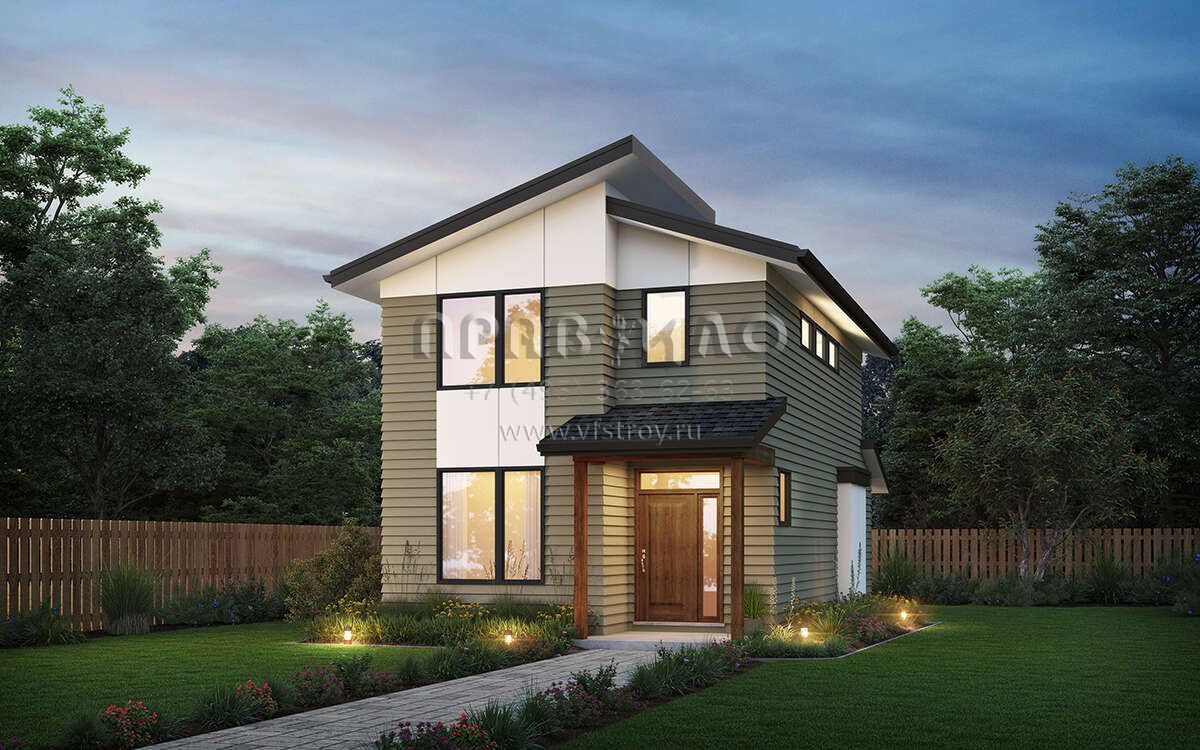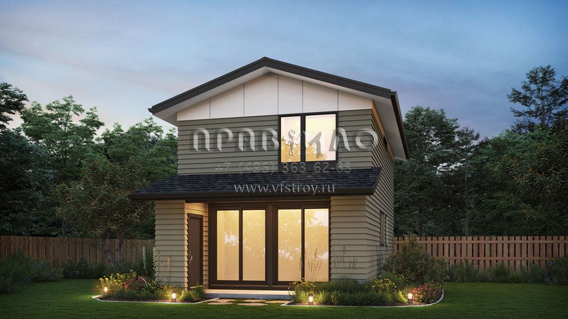 Двухэтажный проект дома позволяет рационально распорядиться площадью участка небольшого размера или узкой формы. На первом этаже находятся общие комнаты (гостиная/столовая, кухня, подсобные и технические помещения), на втором — спальни членов семьи.