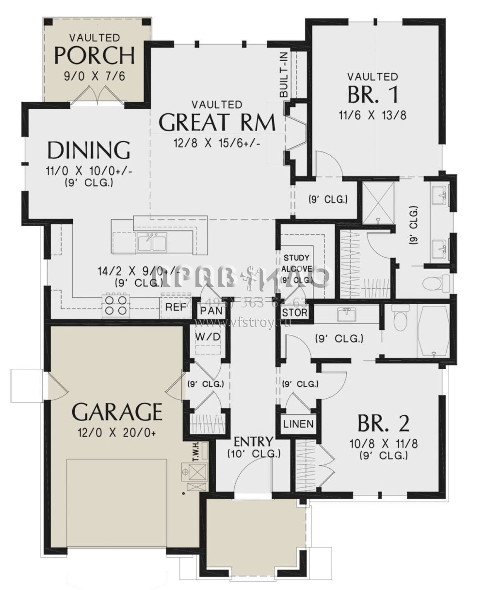 Это проект одноэтажного дома с гаражом на одну машину жилой площадью 119 кв.м. Длина дома 15.2 м, ширина 11.9 м, высота 9.1 м. В доме две спальни и два санузла.