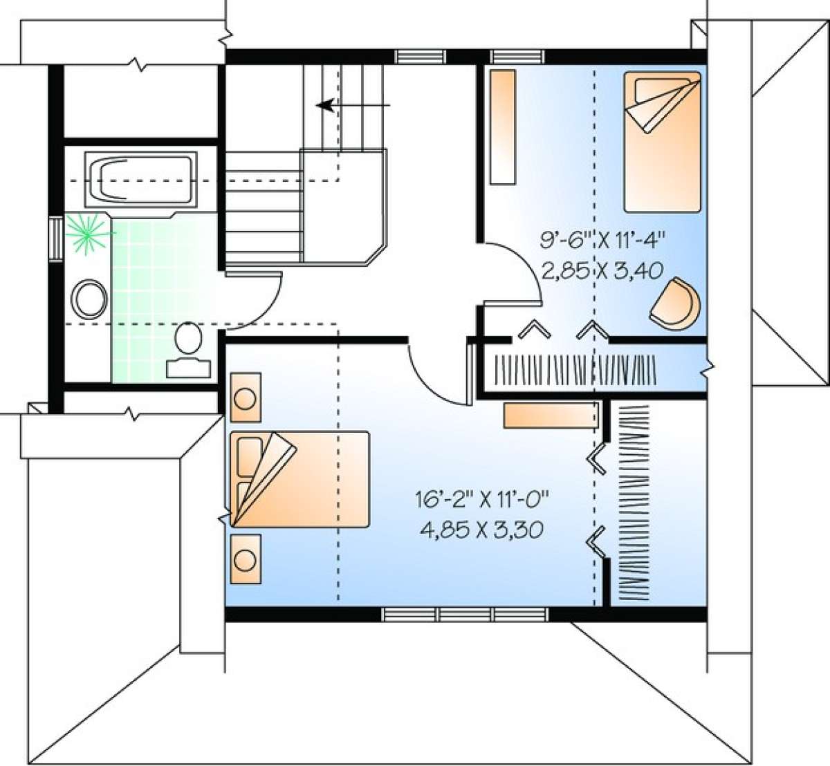 Двухэтажный проект дома позволяет рационально распорядиться площадью участка небольшого размера или узкой формы. На первом этаже находятся общие комнаты (гостиная/столовая, кухня, подсобные и технические помещения), на втором — спальни членов семьи.