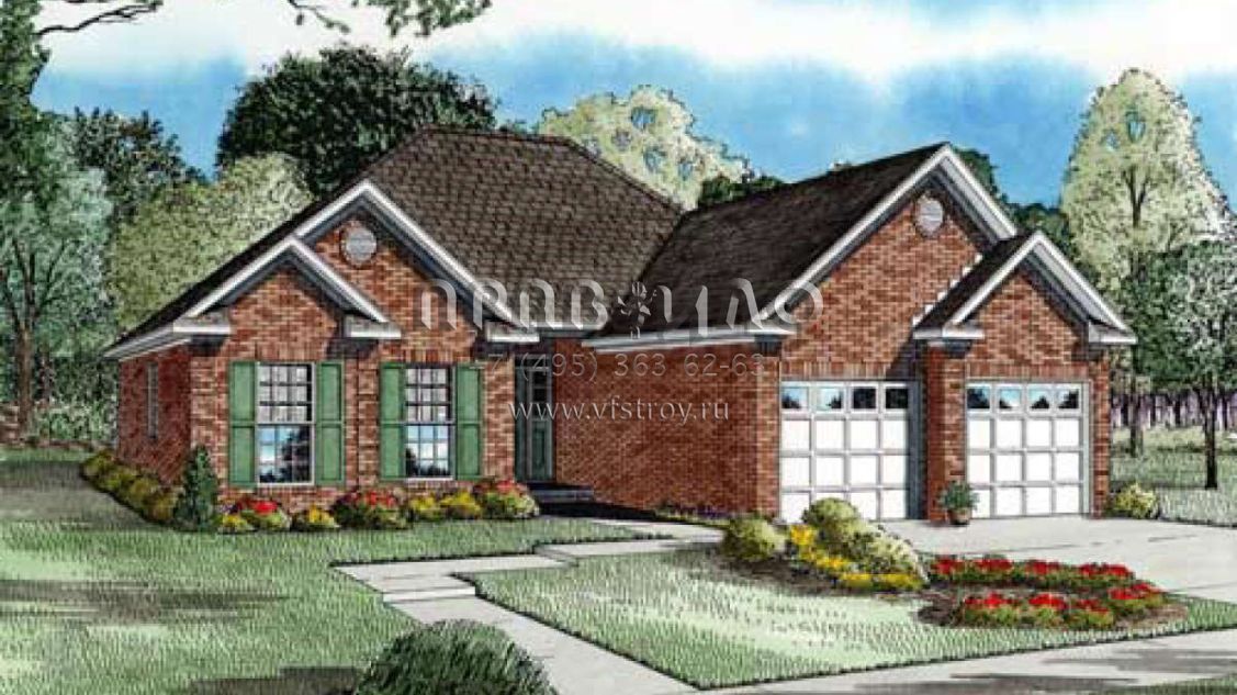 Это проект одноэтажного дома с гаражом на две машины жилой площадью 120 кв.м. Длина дома 18 м, ширина 12.5 м, высота 7 м. В доме две спальни и два санузла.