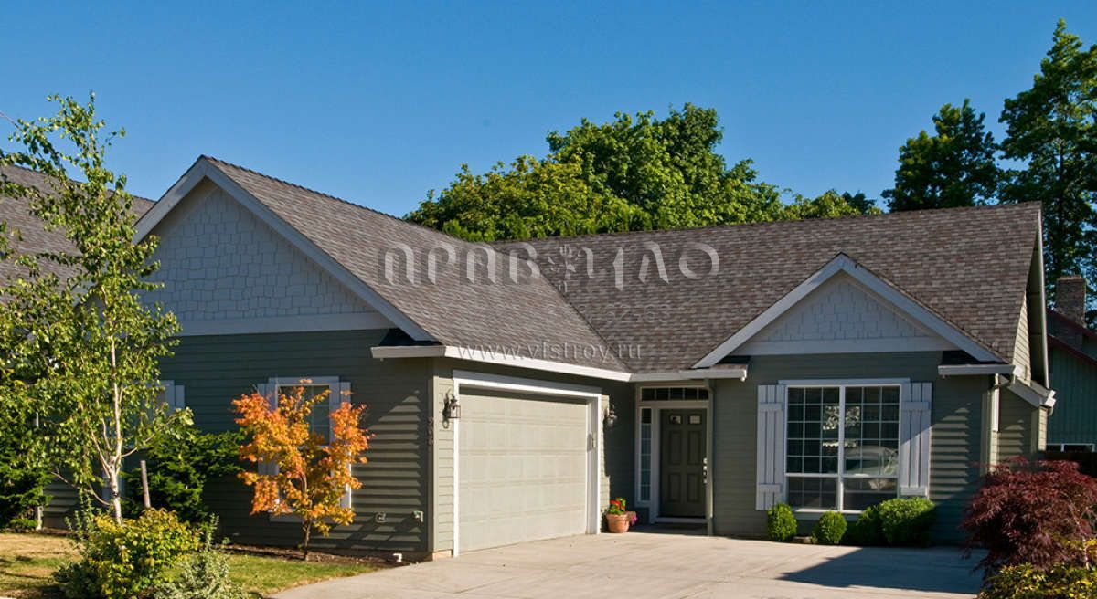 Это проект одноэтажного дома с гаражом на две машины жилой площадью 120 кв.м. Длина дома 18.3 м, ширина 12.8 м, высота 6.7 м. В доме три спальни и два санузла.