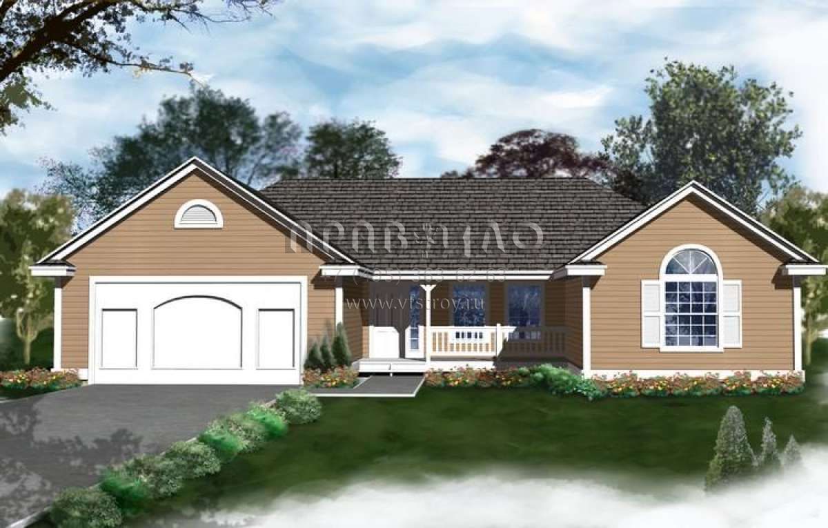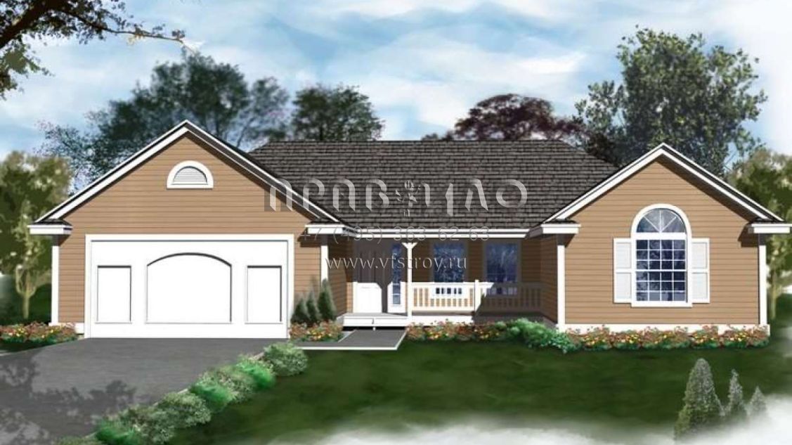 Это проект одноэтажного дома с гаражом на две машины жилой площадью 120 кв.м. Длина дома 12.2 м, ширина 17.1 м, высота 5.5 м. В доме две спальни и два санузла.