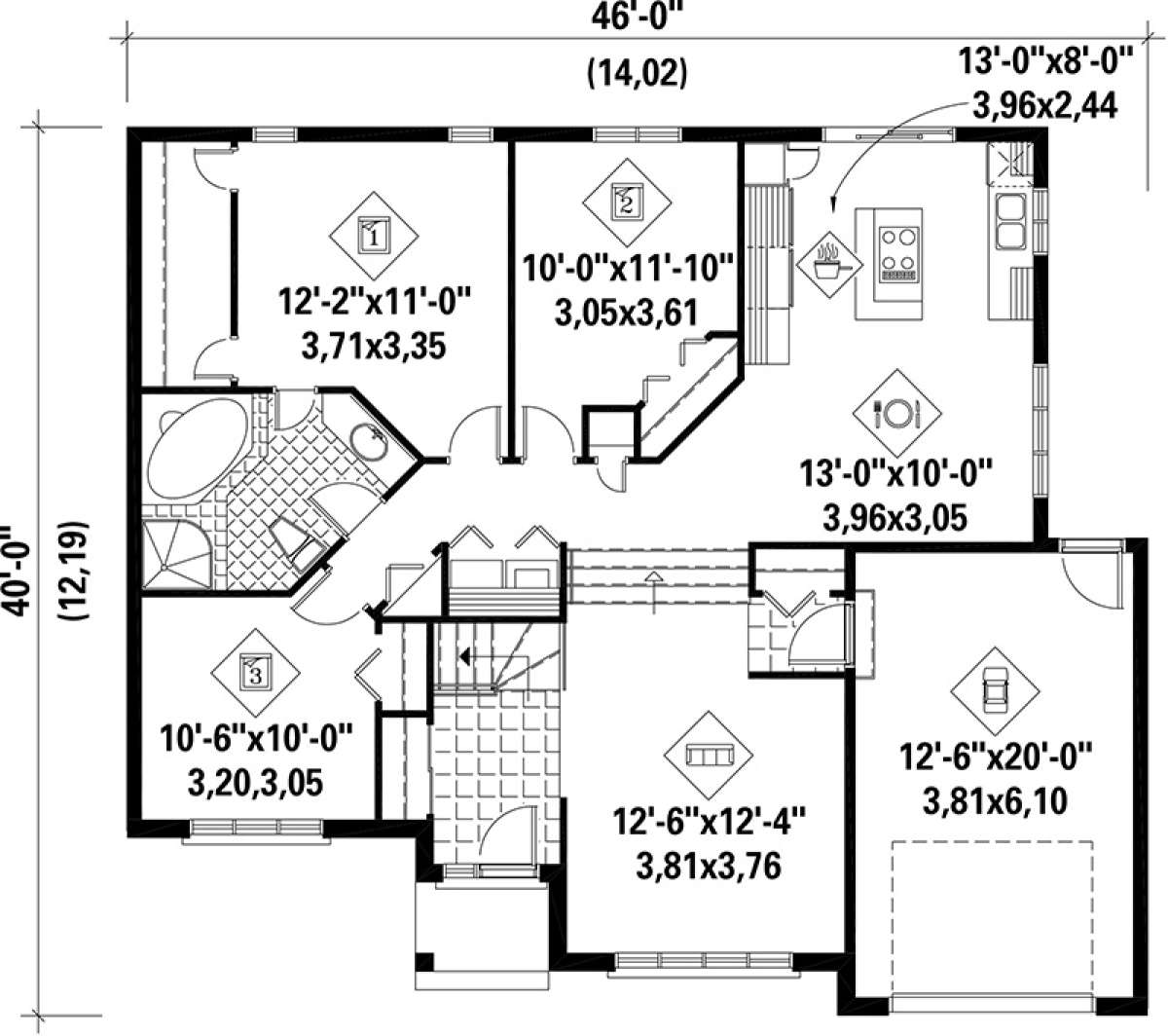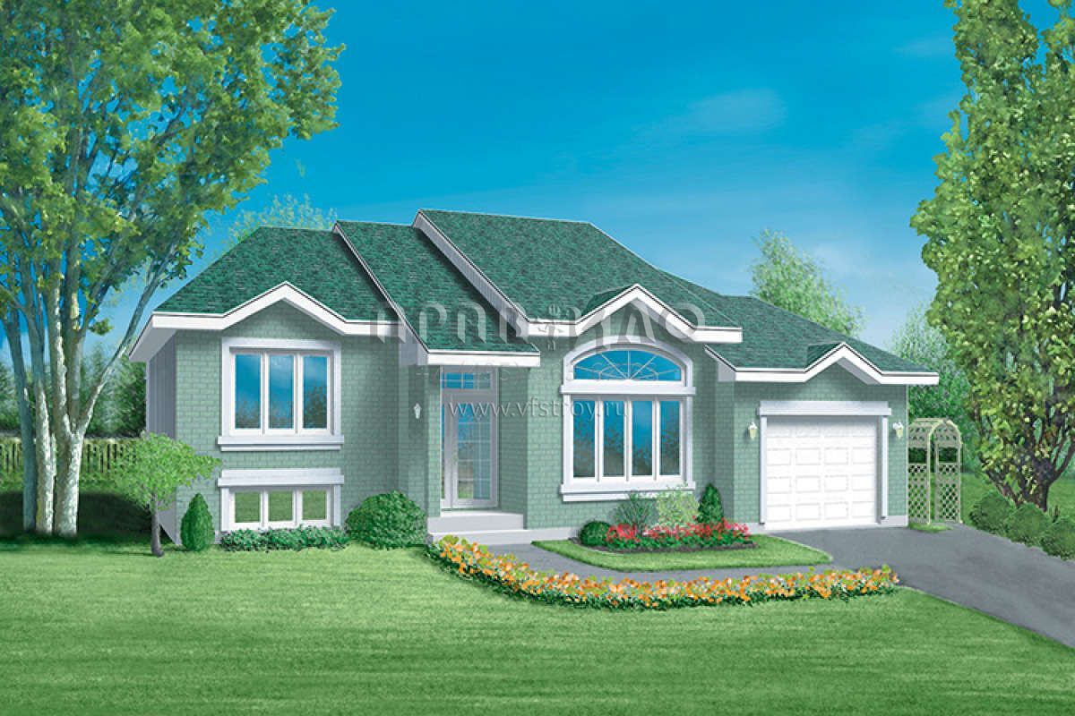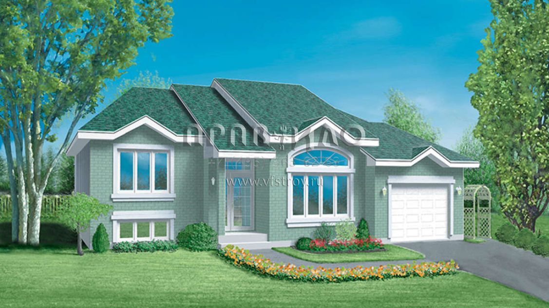 Это проект одноэтажного дома с гаражом на одну машину жилой площадью 122 кв.м. Длина дома 12.5 м, ширина 14 м, высота 0.6 м. В доме три спальни и один санузел.