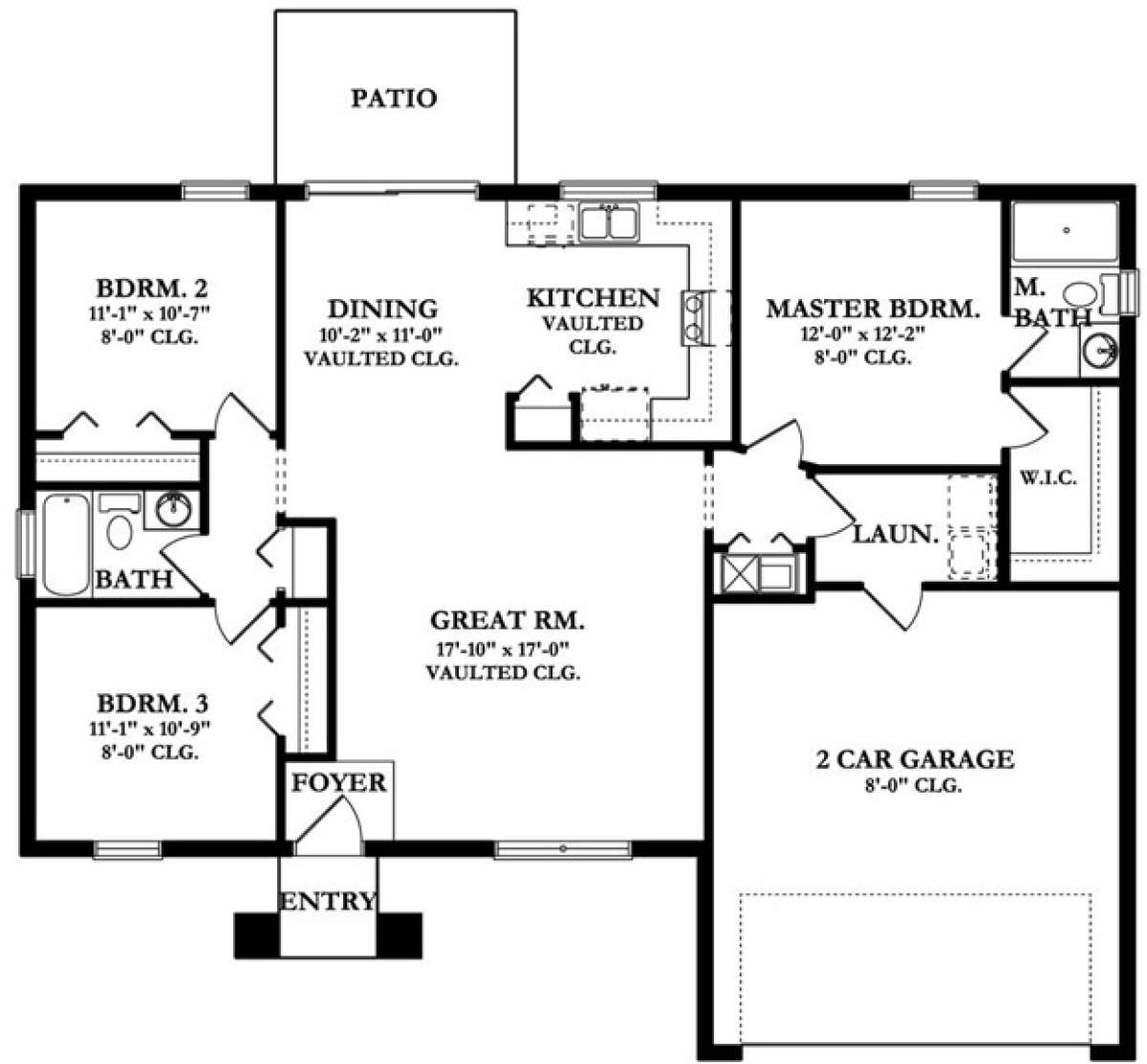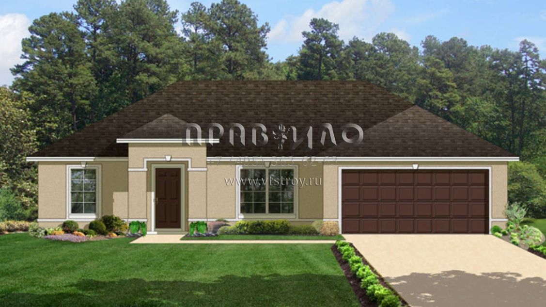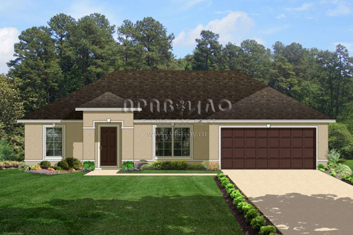 Это проект одноэтажного дома с гаражом на две машины жилой площадью 124 кв.м. Длина дома 12.2 м, ширина 15.5 м, высота 4.9 м. В доме три спальни и два санузла.