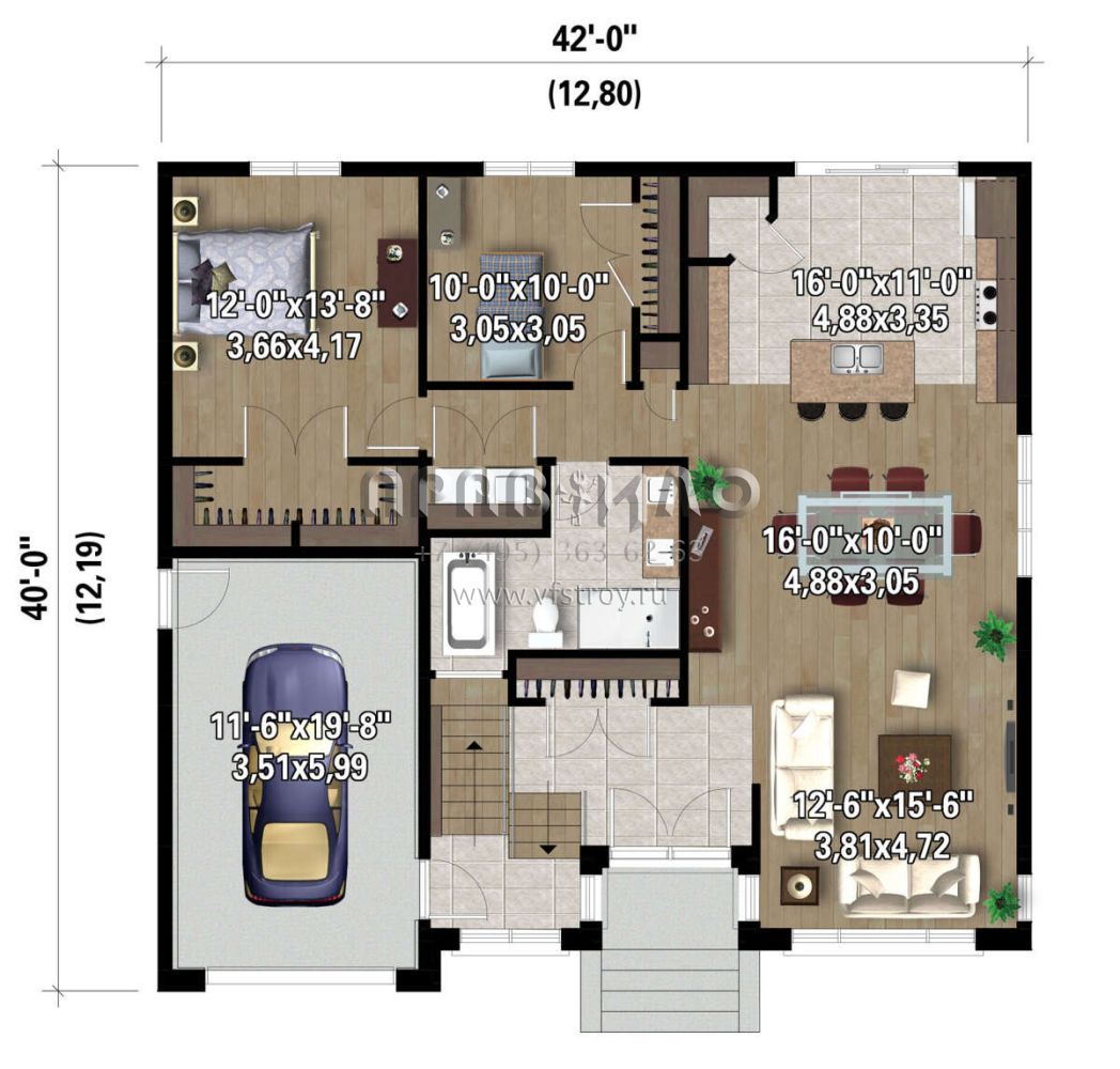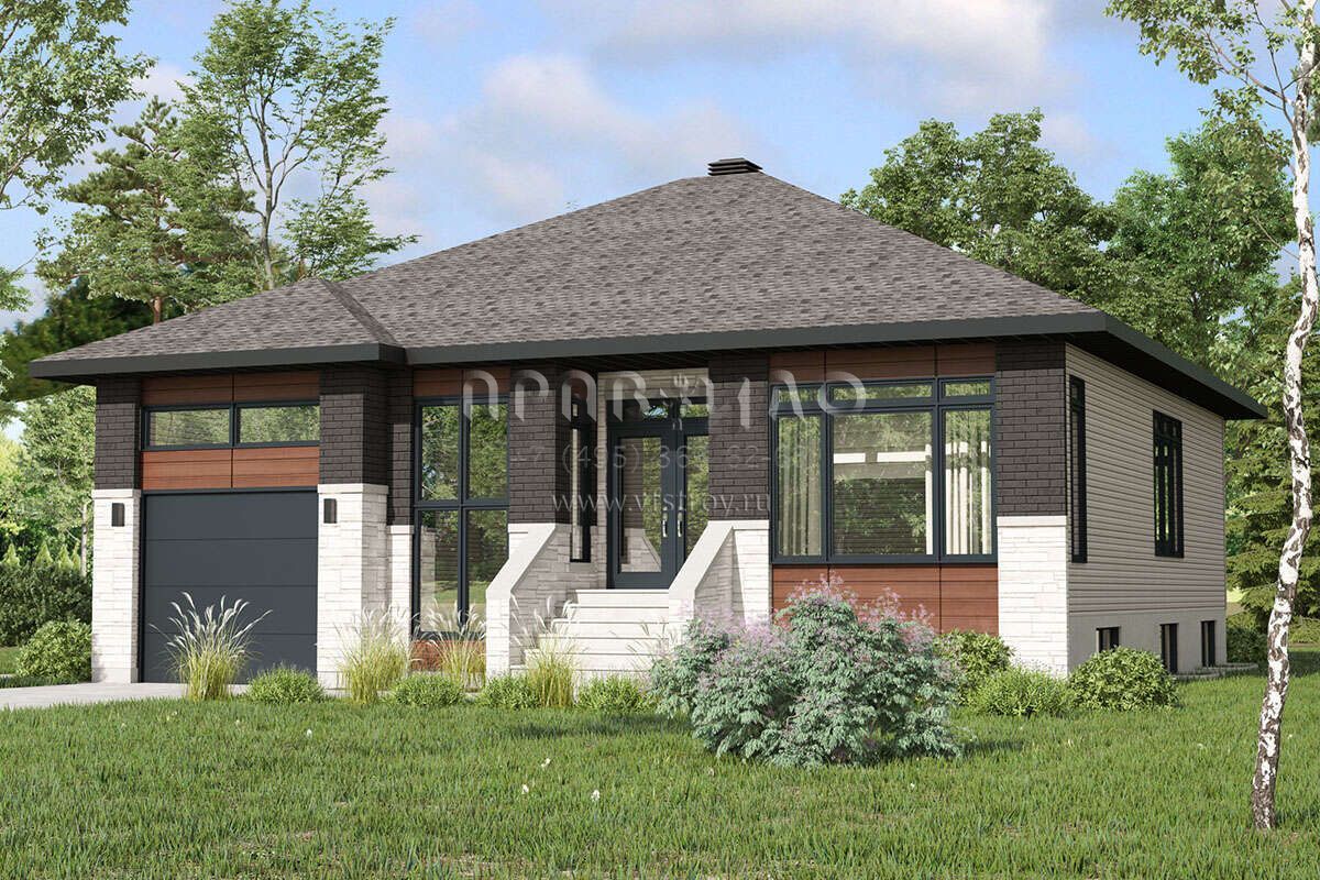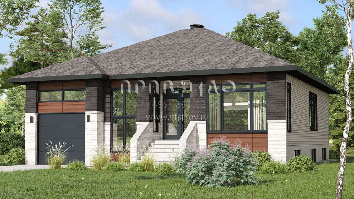 Это проект одноэтажного дома с гаражом на одну машину жилой площадью 124 кв.м. Длина дома 12.2 м, ширина 12.8 м, высота 7.3 м. В доме две спальни и один санузел.