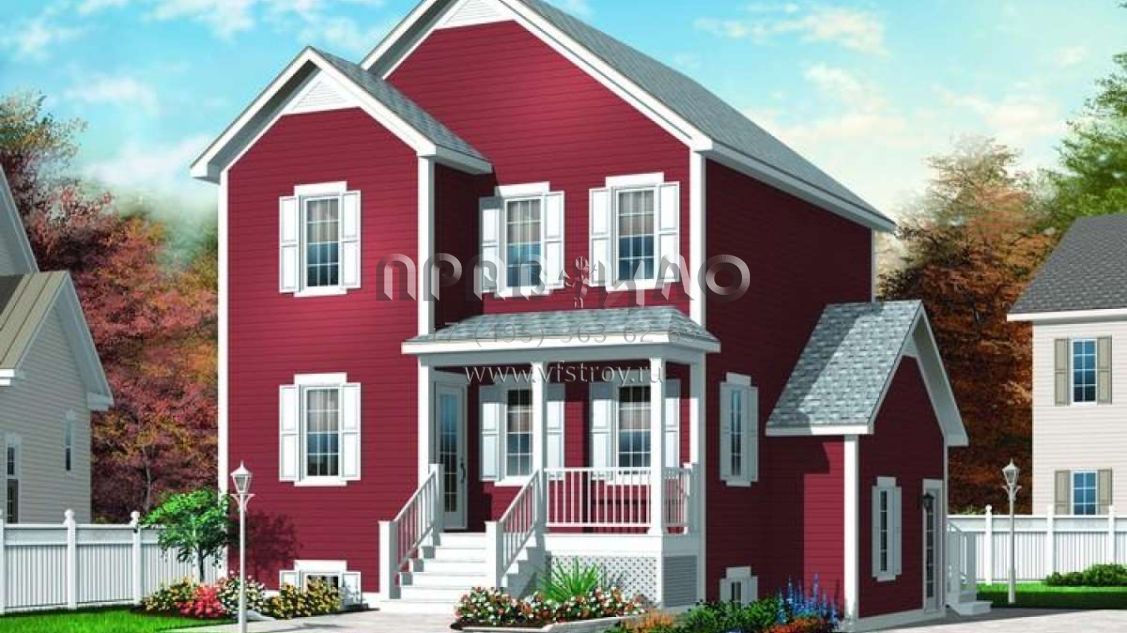 Двухэтажный проект дома позволяет рационально распорядиться площадью участка небольшого размера или узкой формы. На первом этаже находятся общие комнаты (гостиная/столовая, кухня, подсобные и технические помещения), на втором — спальни членов семьи.