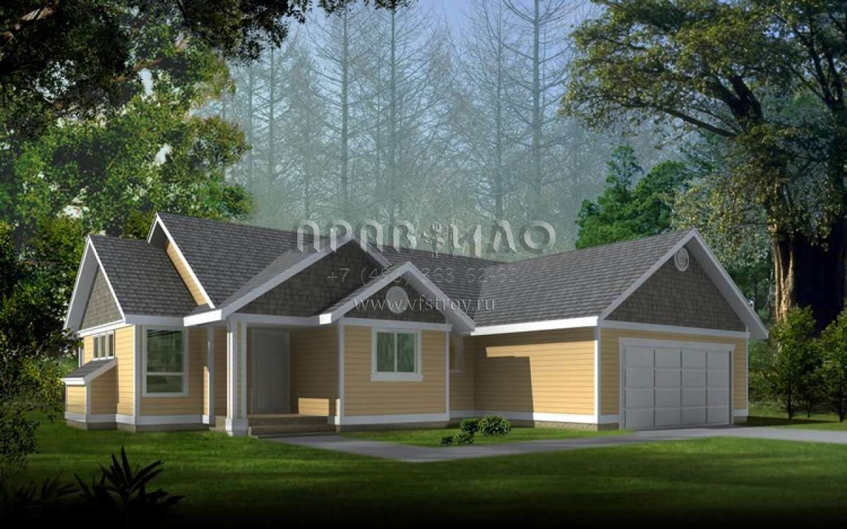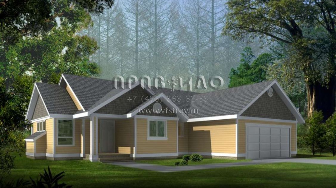 Это проект одноэтажного дома с гаражом на две машины жилой площадью 126 кв.м. Длина дома 15.5 м, ширина 15.8 м, высота 5.5 м. В доме три спальни и два санузла.