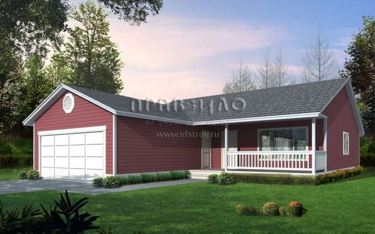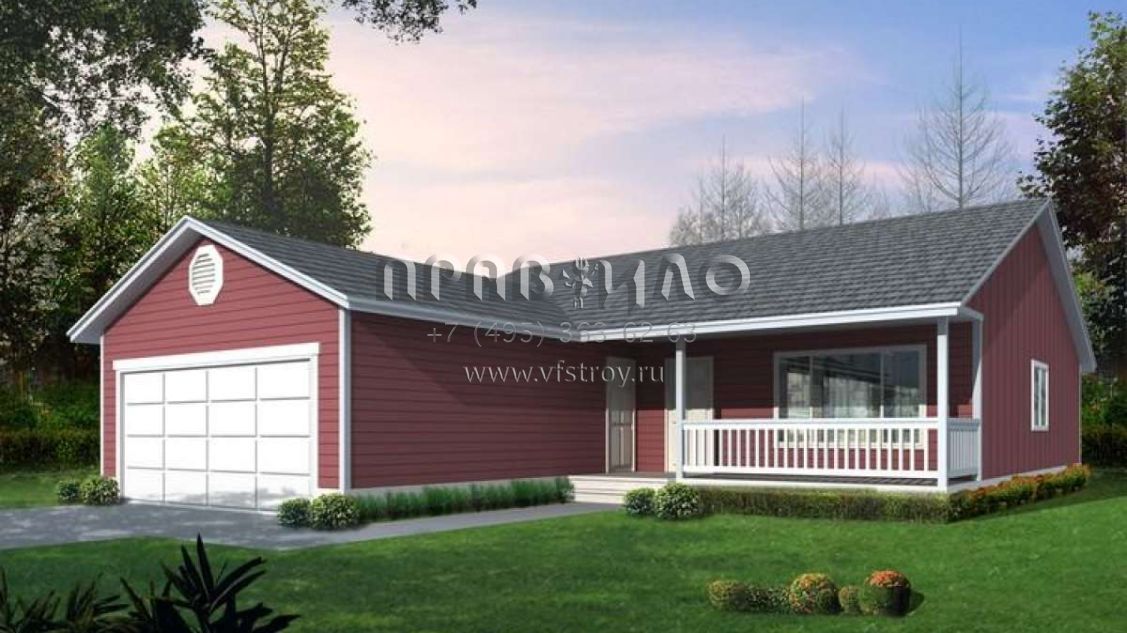 Это проект одноэтажного дома с гаражом на две машины жилой площадью 126 кв.м. Длина дома 17.1 м, ширина 12.2 м, высота 4.9 м. В доме три спальни и два санузла.