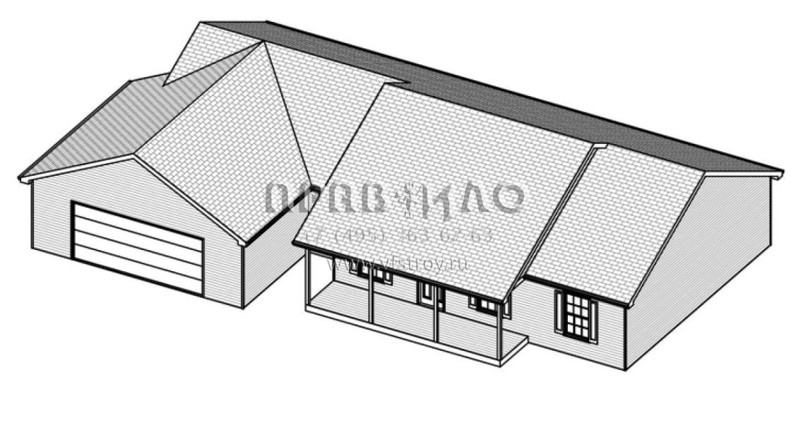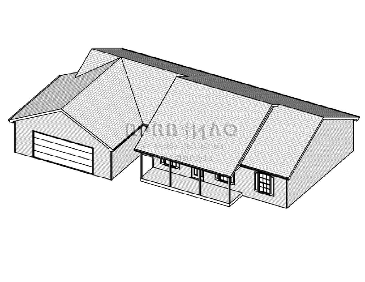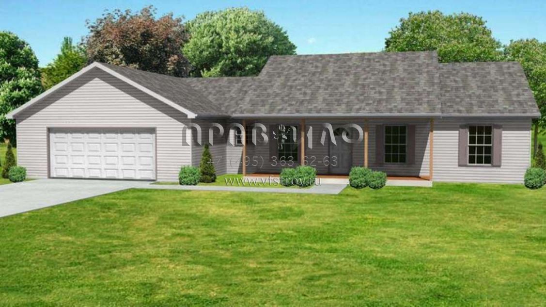 Это проект одноэтажного дома с гаражом на две машины жилой площадью 126 кв.м. Длина дома 12.2 м, ширина 20.7 м, высота 5.8 м. В доме три спальни и два санузла.
