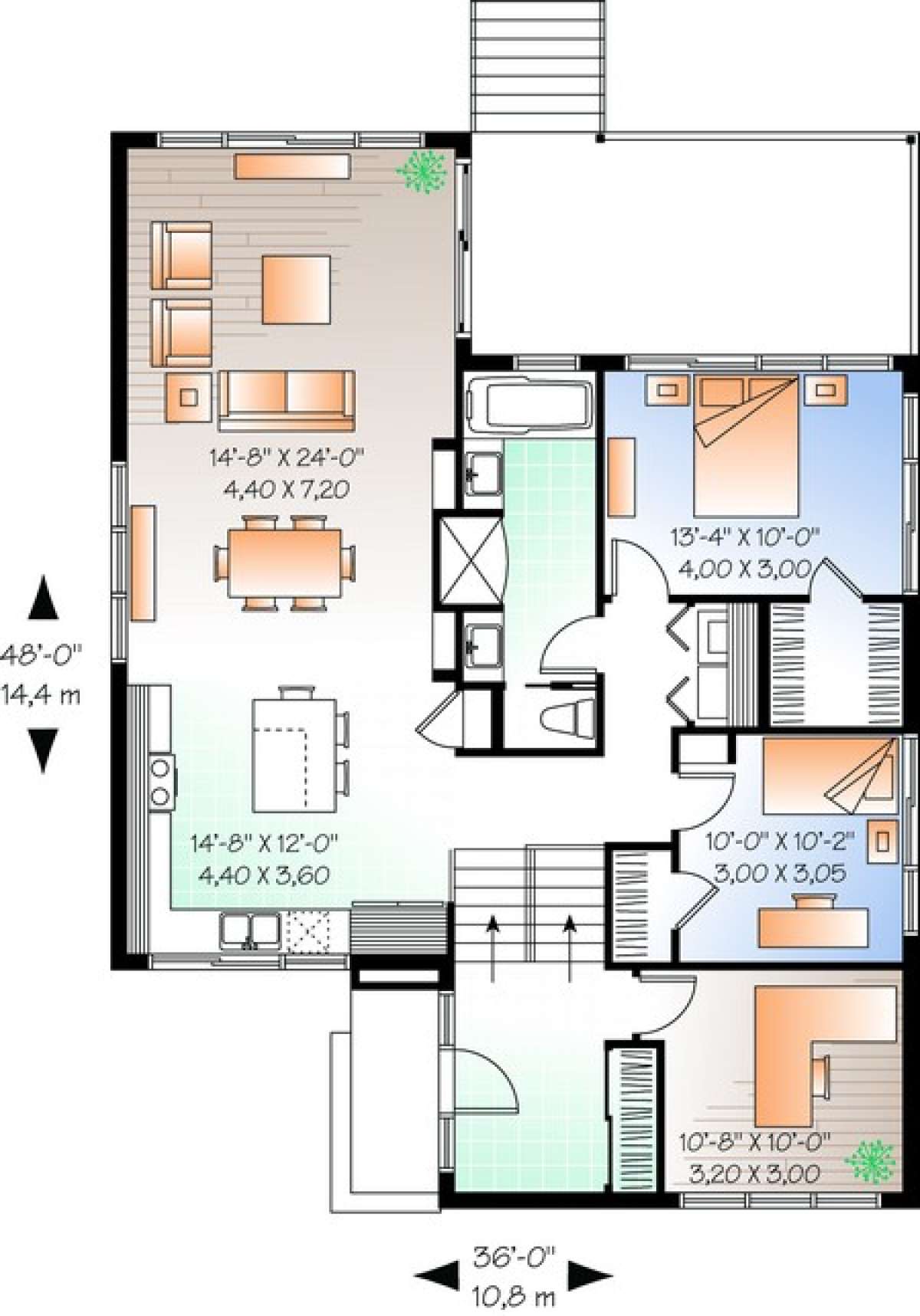 S5-127 (034-00221) Это иностранный проект, для которого требуется адаптация под нормы, действующие в Российской Федерации. Вы видите проект дома в современном стиле. В этом доме сочетаются черты сельской постройки и аскетичность лофта. Внутри жильцы смогут проводить время с максимальным комфортом. Обратим внимание, что сейчас на планировках все размеры представлены в футах. Для перевода в метры вам необходимо значение в футах умножить на 0,3048.