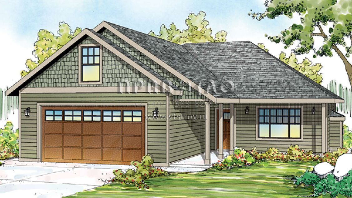 Это проект одноэтажного дома с гаражом на две машины жилой площадью 127 кв.м. Длина дома 18 м, ширина 13.4 м, высота 6.1 м. В доме три спальни и два санузла.