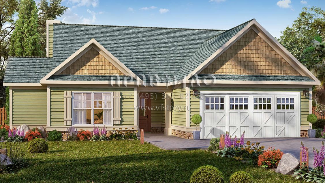 Это проект одноэтажного дома с гаражом на две машины жилой площадью 127 кв.м. Длина дома 16.5 м, ширина 15.5 м, высота 6.4 м. В доме три спальни и два санузла.