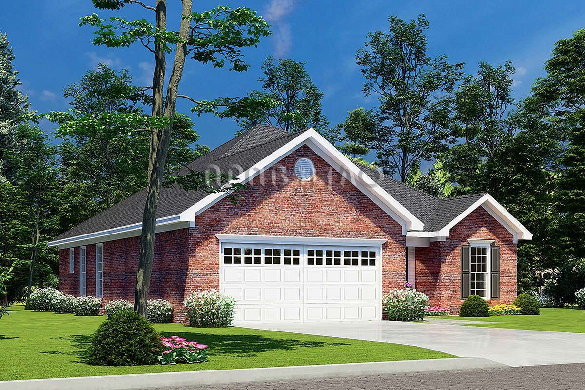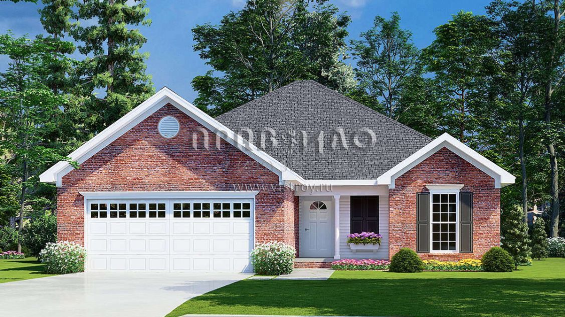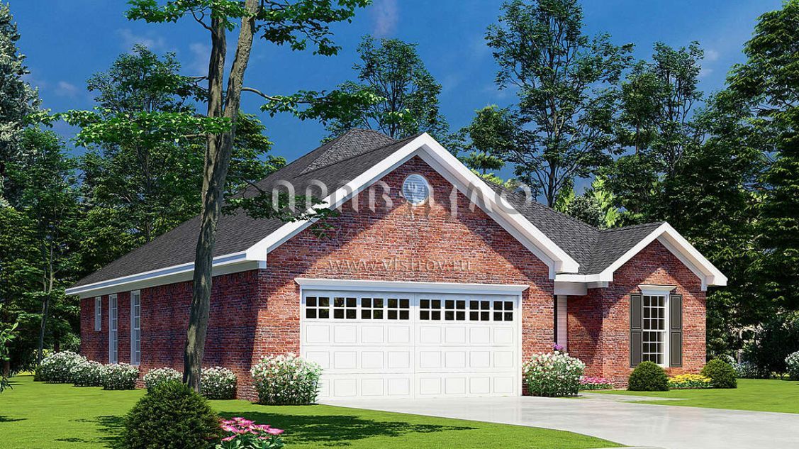 Это проект одноэтажного дома с гаражом на две машины жилой площадью 128 кв.м. Длина дома 14.6 м, ширина 12.5 м, высота 6.7 м. В доме три спальни и два санузла.