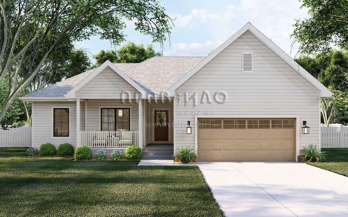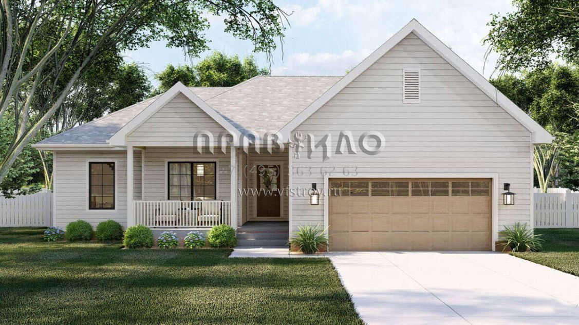 Это проект одноэтажного дома с гаражом на две машины жилой площадью 128 кв.м. Длина дома 14.6 м, ширина 15.2 м, высота 6.1 м. В доме три спальни и два санузла.