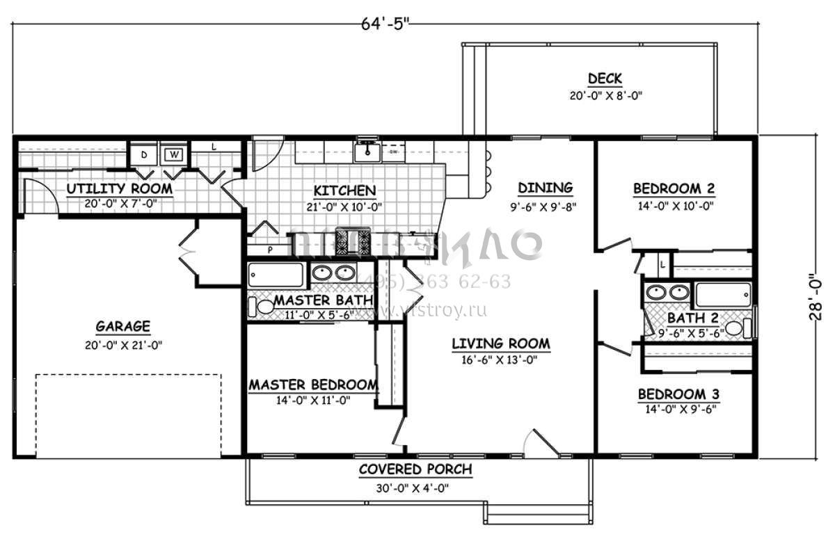 S5-129 (526-00078) Это иностранный проект, для которого требуется адаптация под нормы, действующие в Российской Федерации. Вы видите проект дома в стиле Ранчо. В этом доме сочетаются черты сельской постройки и аскетичность лофта. Внутри жильцы смогут проводить время с максимальным комфортом. Обратим внимание, что сейчас на планировках все размеры представлены в футах. Для перевода в метры вам необходимо значение в футах умножить на 0,3048.