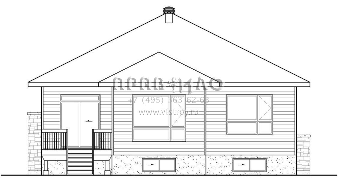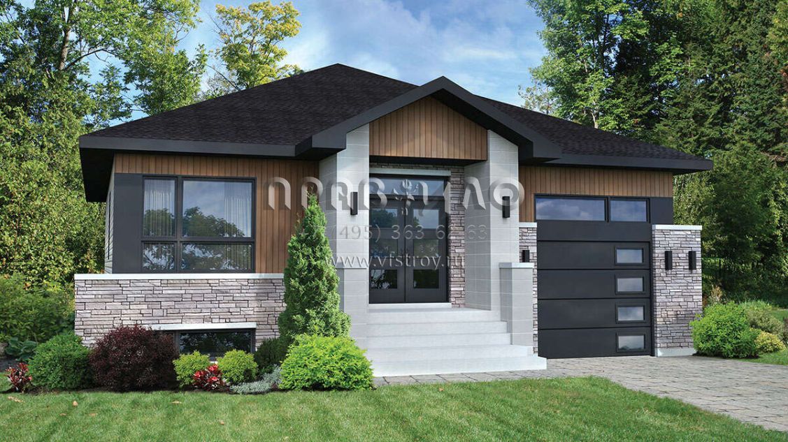 Это проект одноэтажного дома с гаражом на одну машину жилой площадью 129 кв.м. Длина дома 14 м, ширина 8.5 м, высота 7.3 м. В доме две спальни и два санузла.