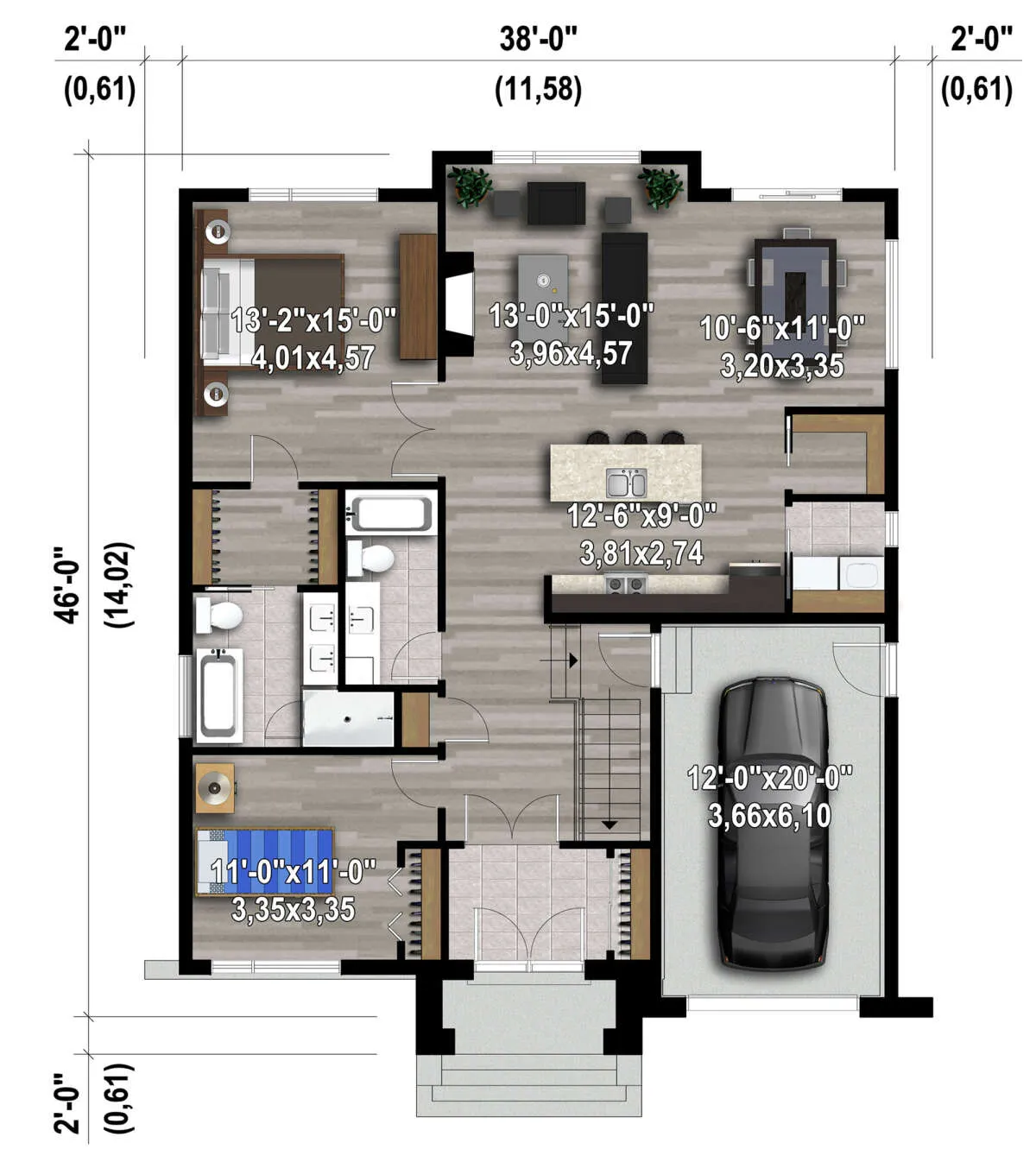 S5-129 (6146-00590) Это иностранный проект, для которого требуется адаптация под нормы, действующие в Российской Федерации. Вы видите проект дома в современном стиле. В этом доме сочетаются черты сельской постройки и аскетичность лофта. Внутри жильцы смогут проводить время с максимальным комфортом. Обратим внимание, что сейчас на планировках все размеры представлены в футах. Для перевода в метры вам необходимо значение в футах умножить на 0,3048.