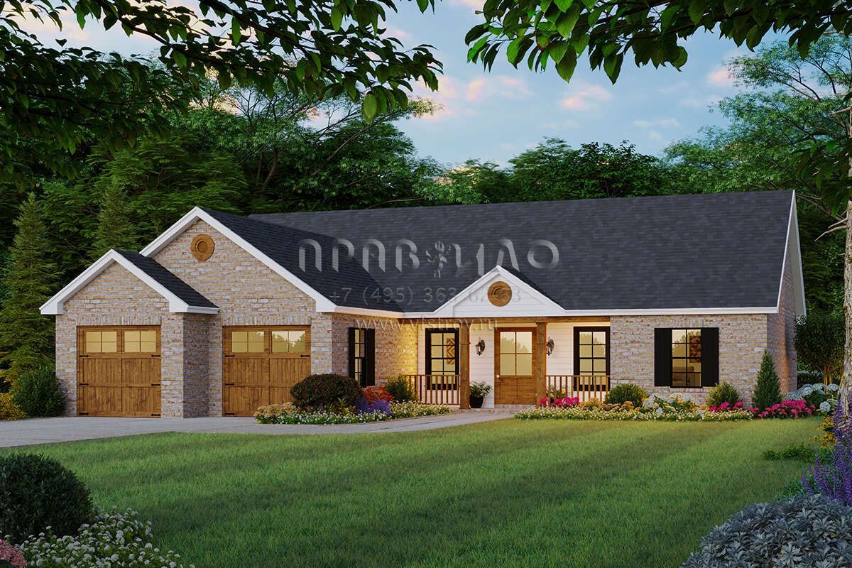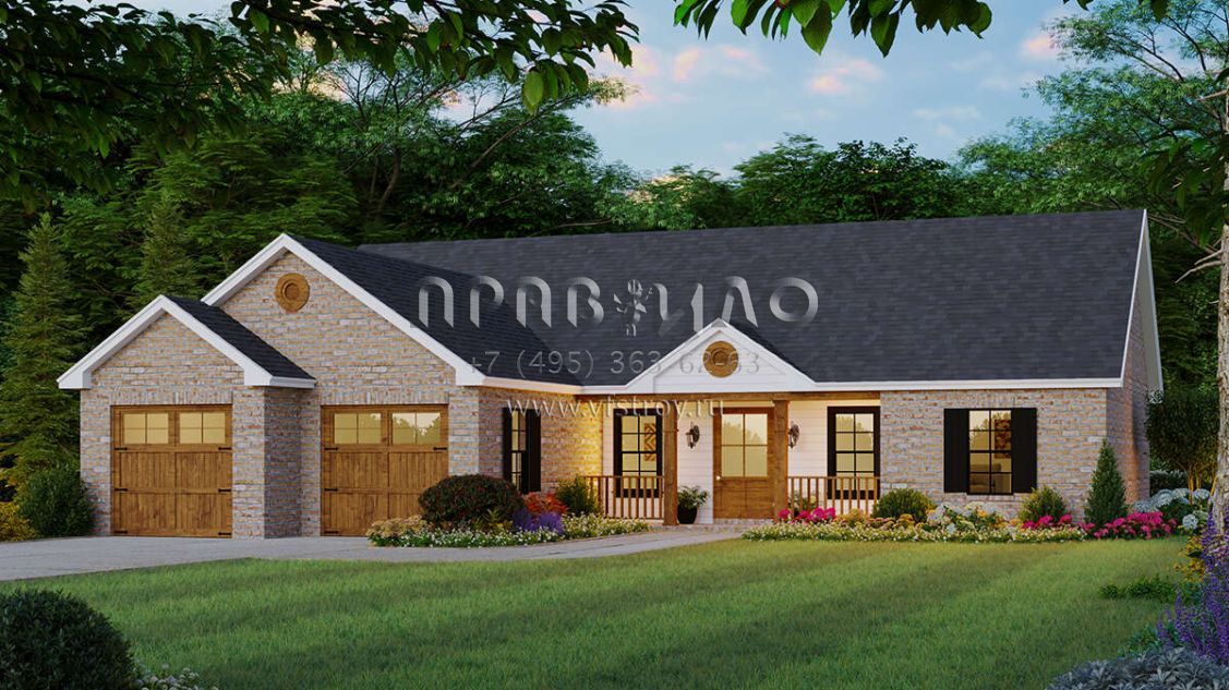Это проект одноэтажного дома с гаражом на две машины жилой площадью 130 кв.м. Длина дома 14.3 м, ширина 16.5 м, высота 5.8 м. В доме три спальни и два санузла.