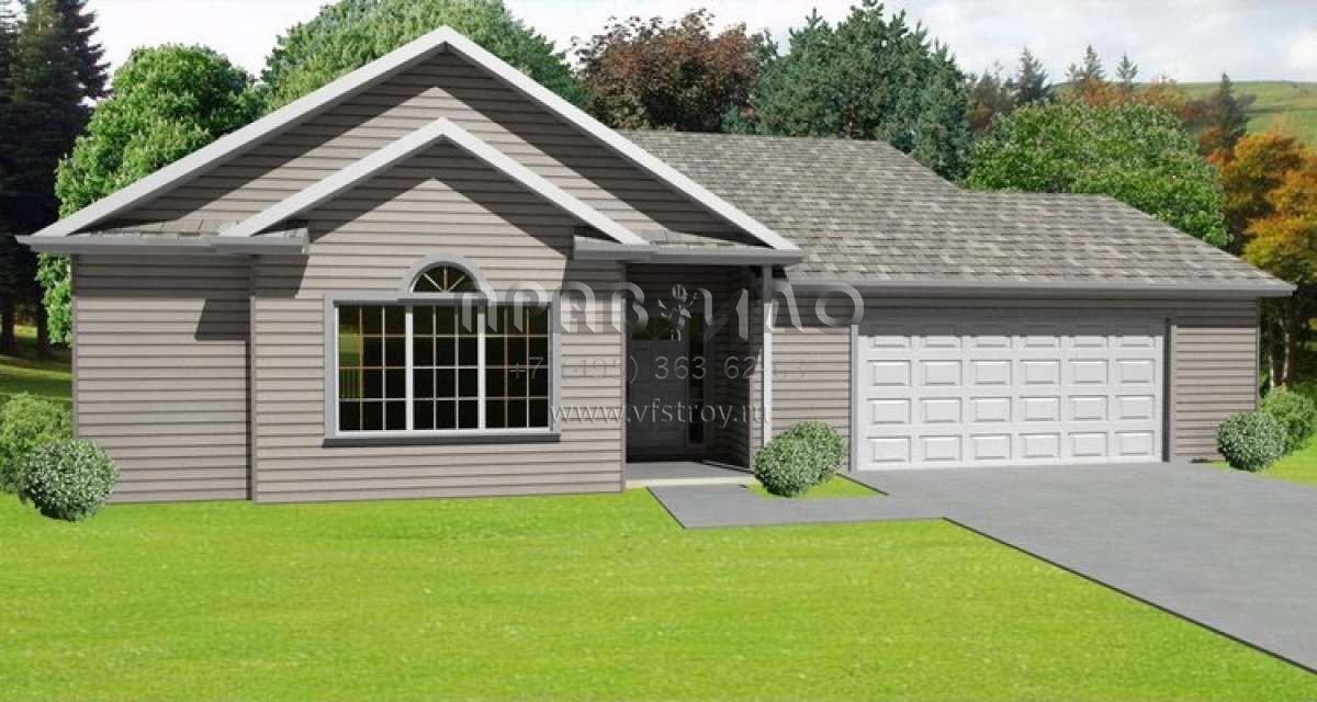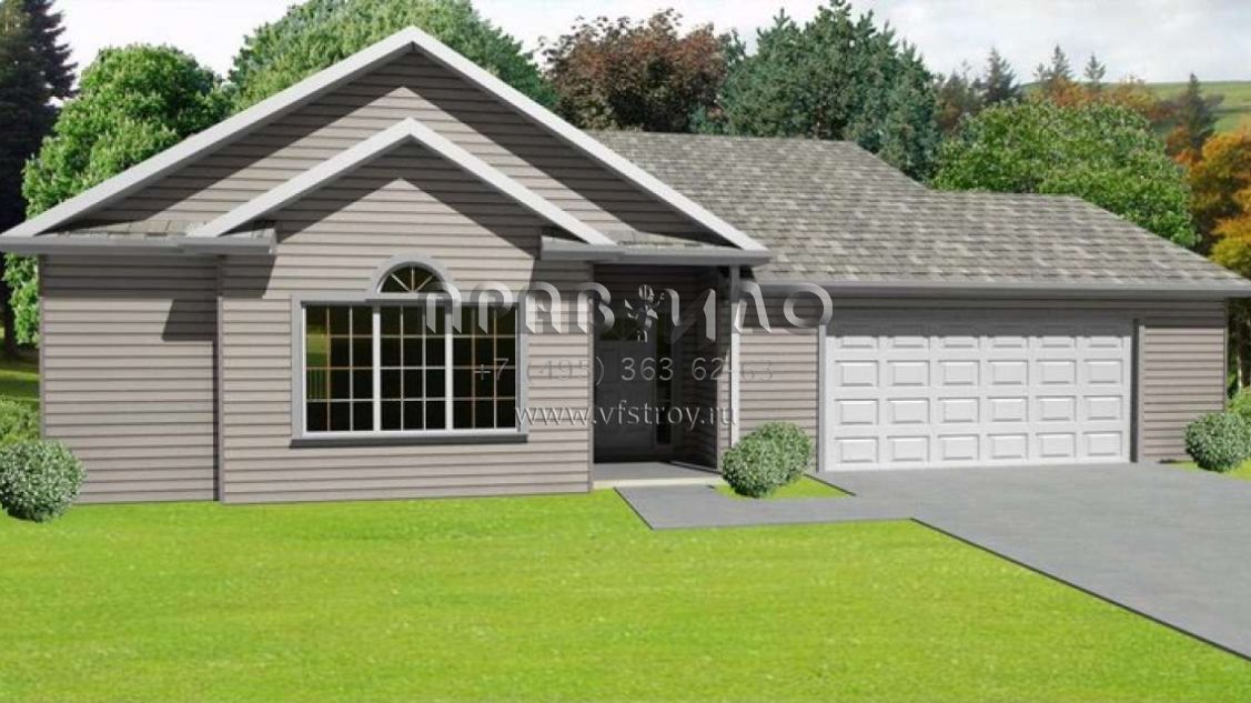 Это проект одноэтажного дома с гаражом на две машины жилой площадью 131 кв.м. Длина дома 14.9 м, ширина 15.8 м, высота 6.4 м. В доме три спальни и два санузла.