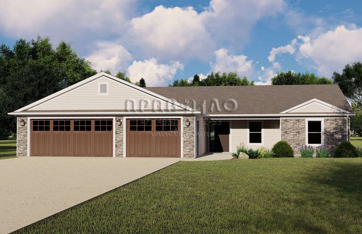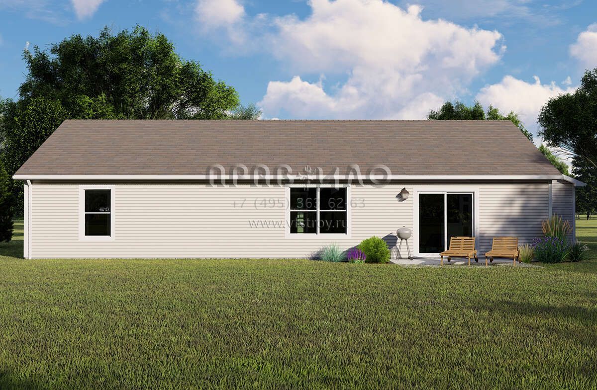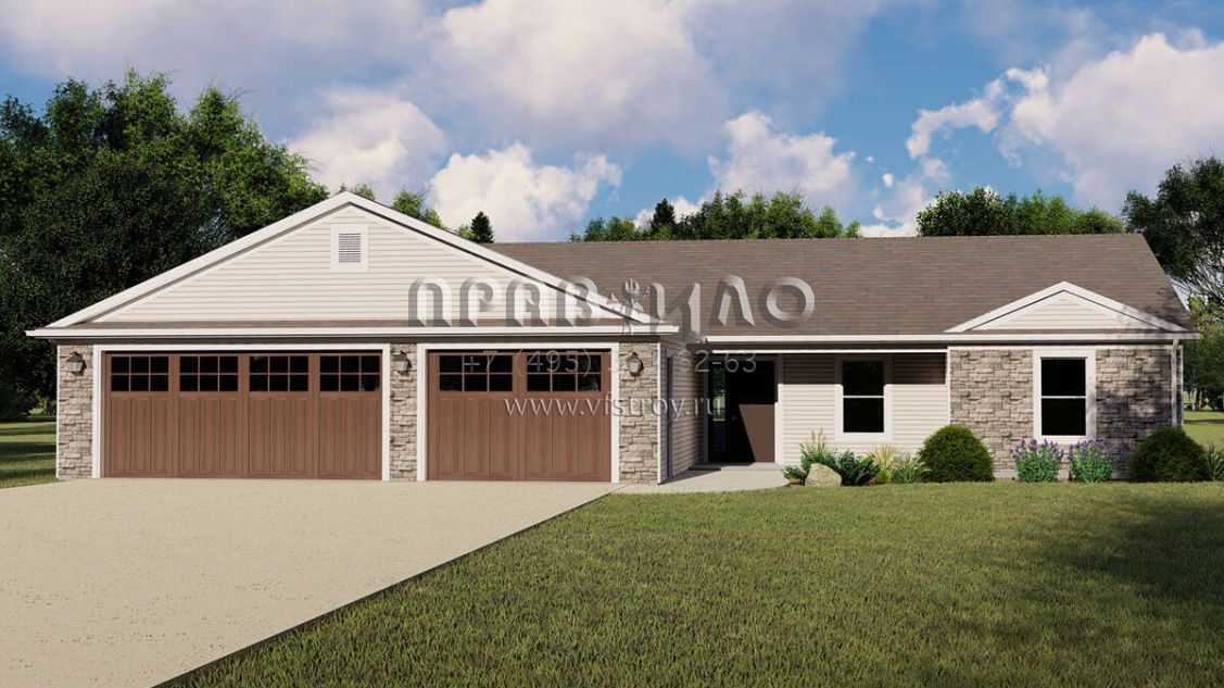 Это проект одноэтажного дома с гаражом на две машины жилой площадью 132 кв.м. Длина дома 14.9 м, ширина 18.9 м, высота 4.6 м. В доме три спальни и три санузла.