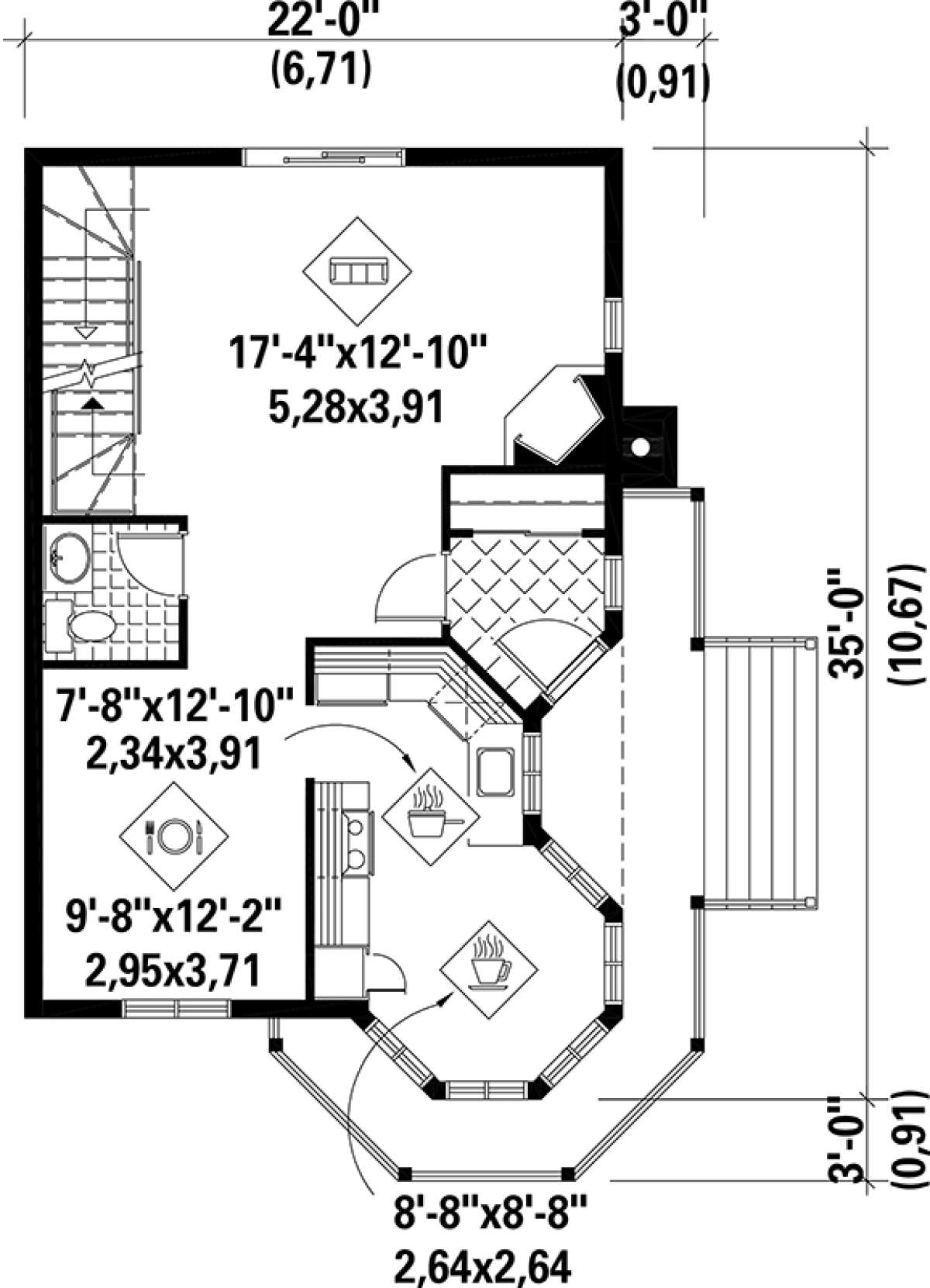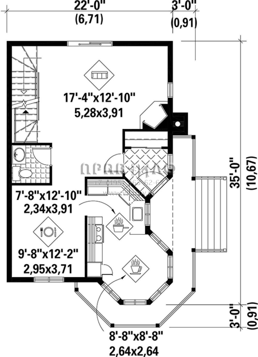 S5-133 (6146-00116) Это иностранный проект, для которого требуется адаптация под нормы, действующие в Российской Федерации. Вы видите проект дома в английском стиле. В этом доме сочетаются черты сельской постройки и аскетичность лофта. Внутри жильцы смогут проводить время с максимальным комфортом. Обратим внимание, что сейчас на планировках все размеры представлены в футах. Для перевода в метры вам необходимо значение в футах умножить на 0,3048.